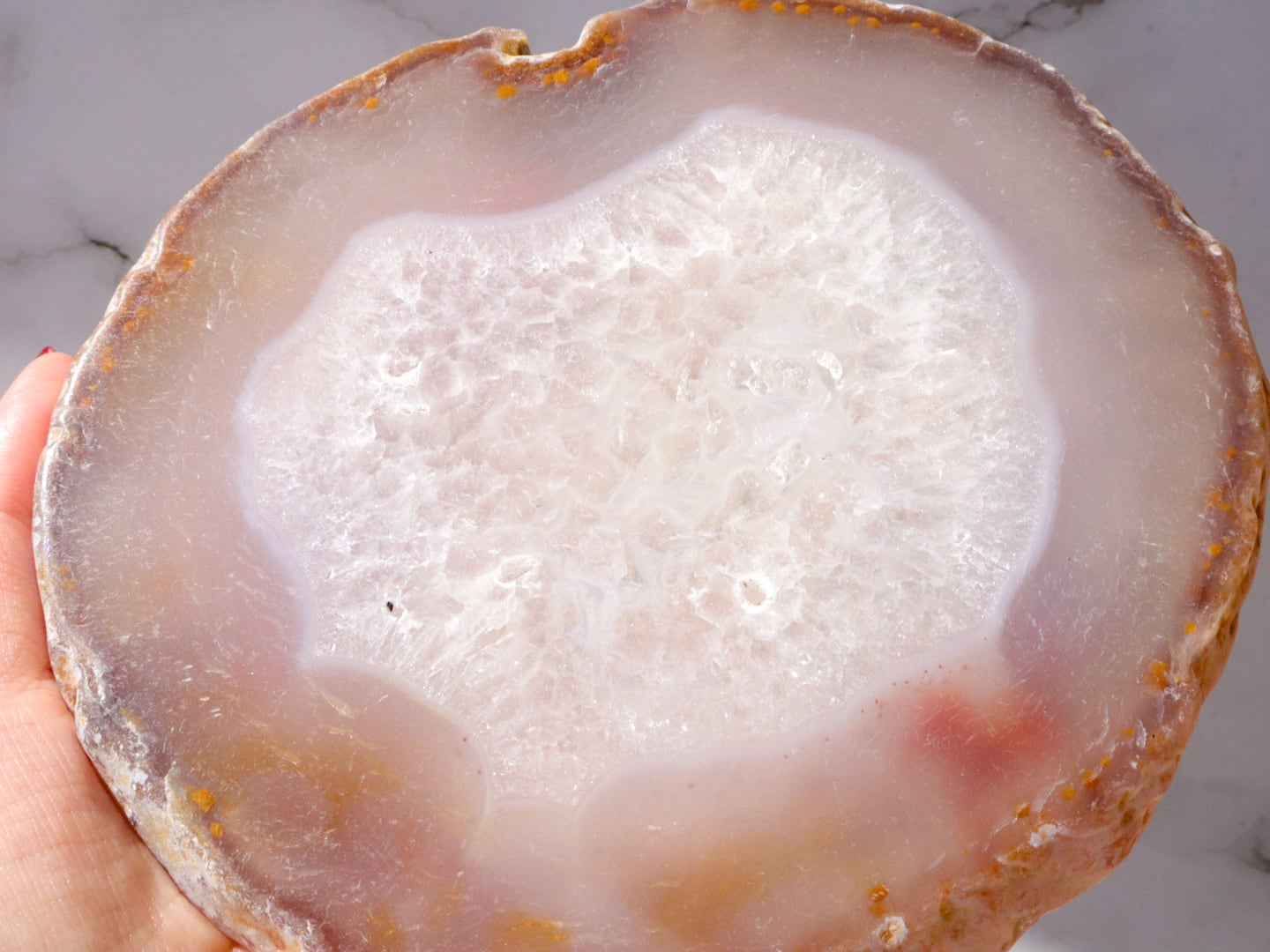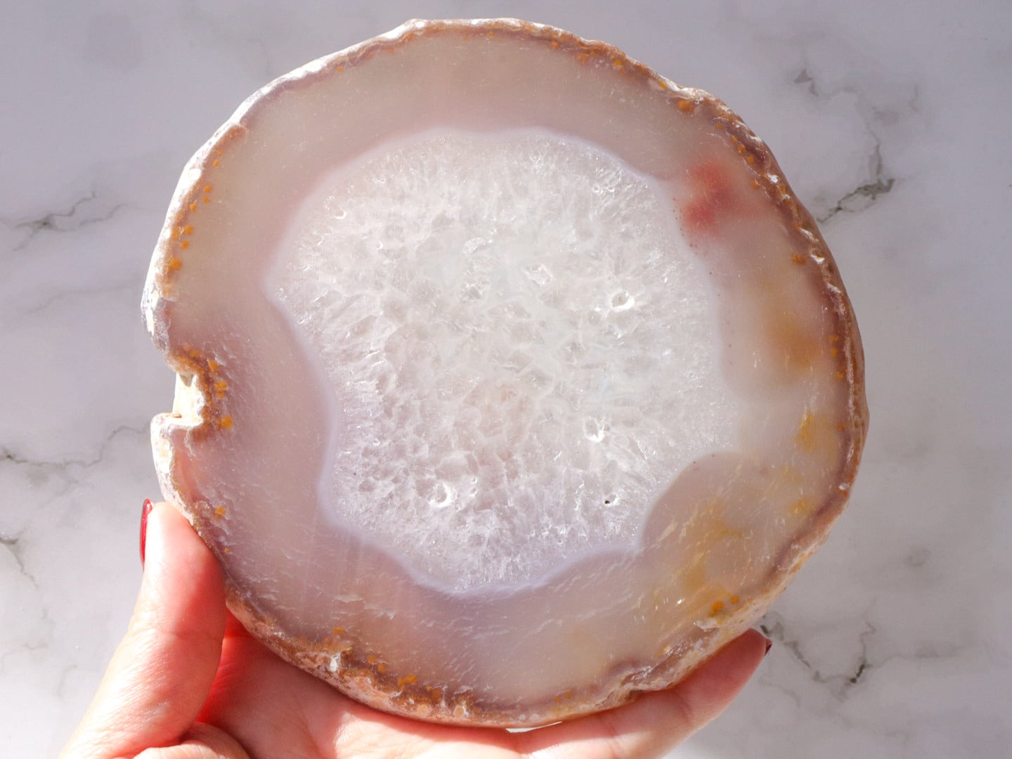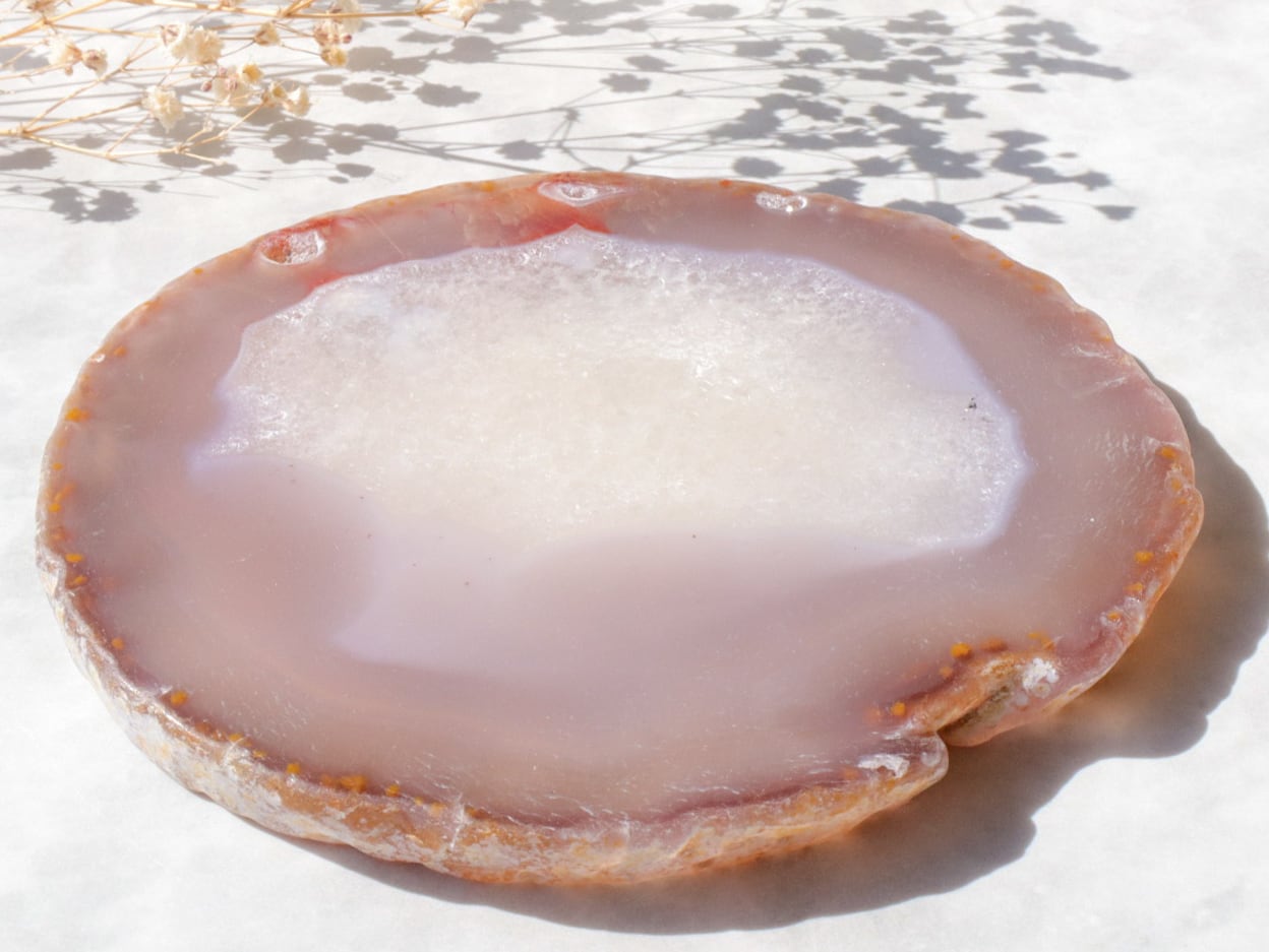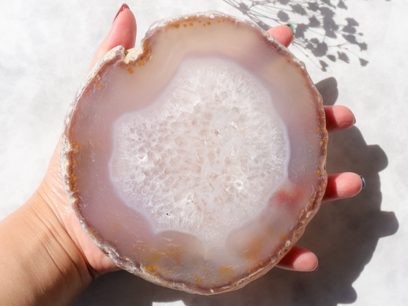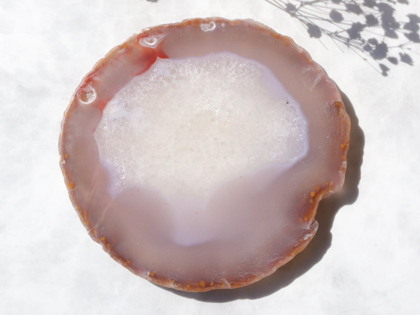 真ん中が白くてザクザクの瑪瑙プレートのご紹介です✨パープルやグレー、ブラウンともつかない落ち着いたお色は、上に乗せるものの邪魔をしないシンプルかつおしゃれなプレートだと思います♡♡♡場所によって、黄色や、オレンジのような箇所もあり、ナチュラル感満載です✨プレートの縁もなんだか切り株のようで可愛いです♡重さと大きさのわりにはお安いと思います✨✨