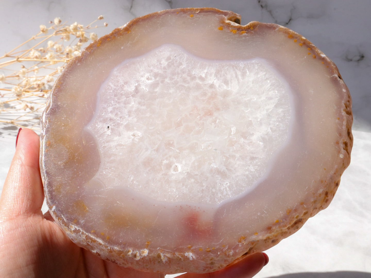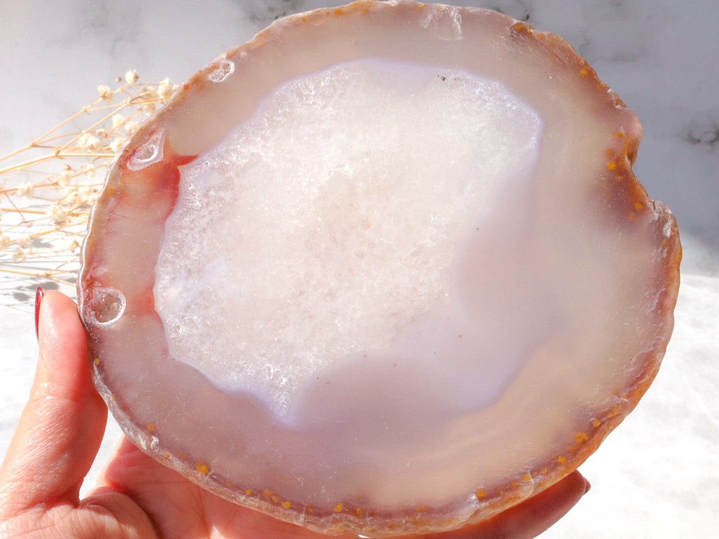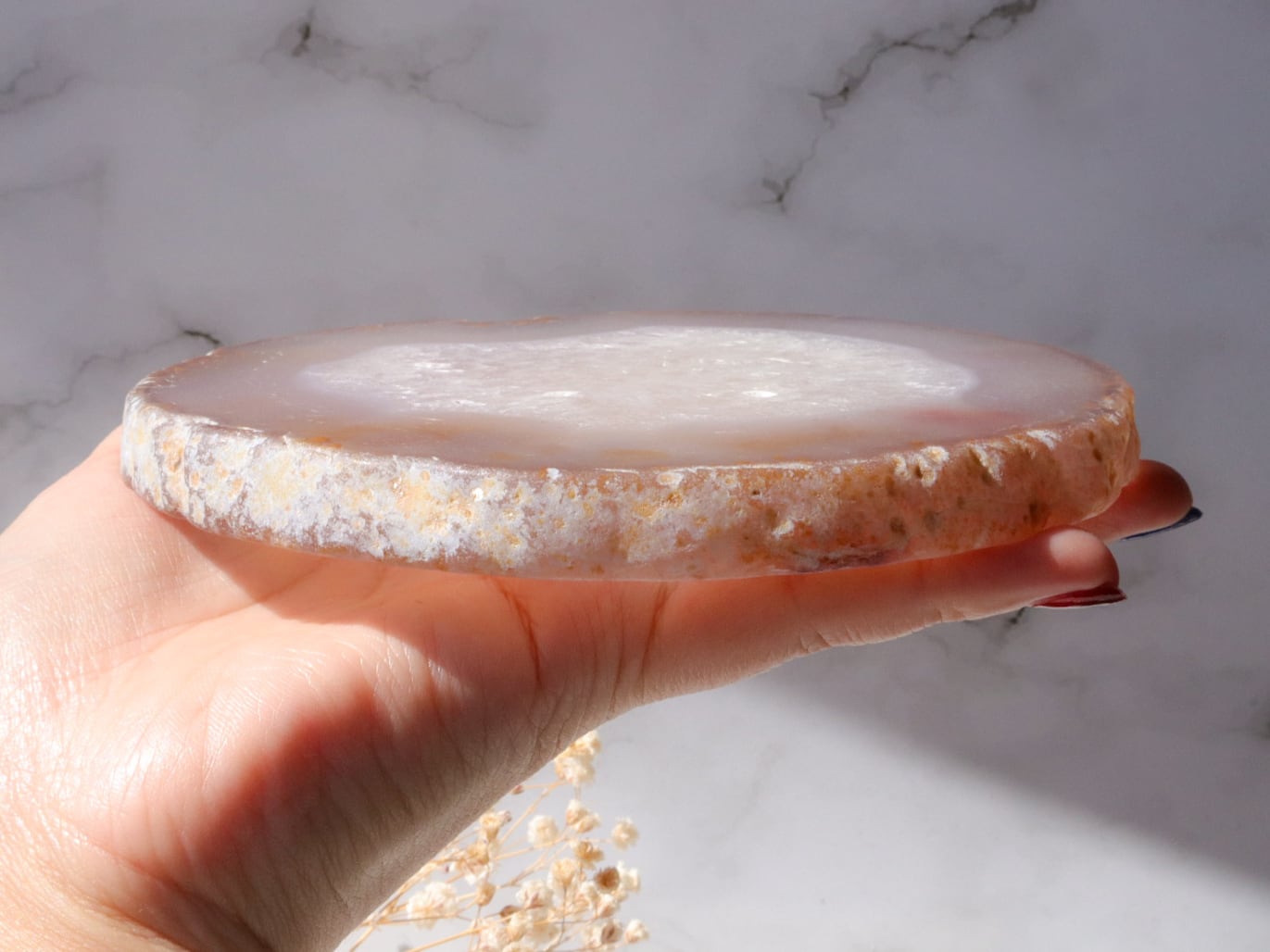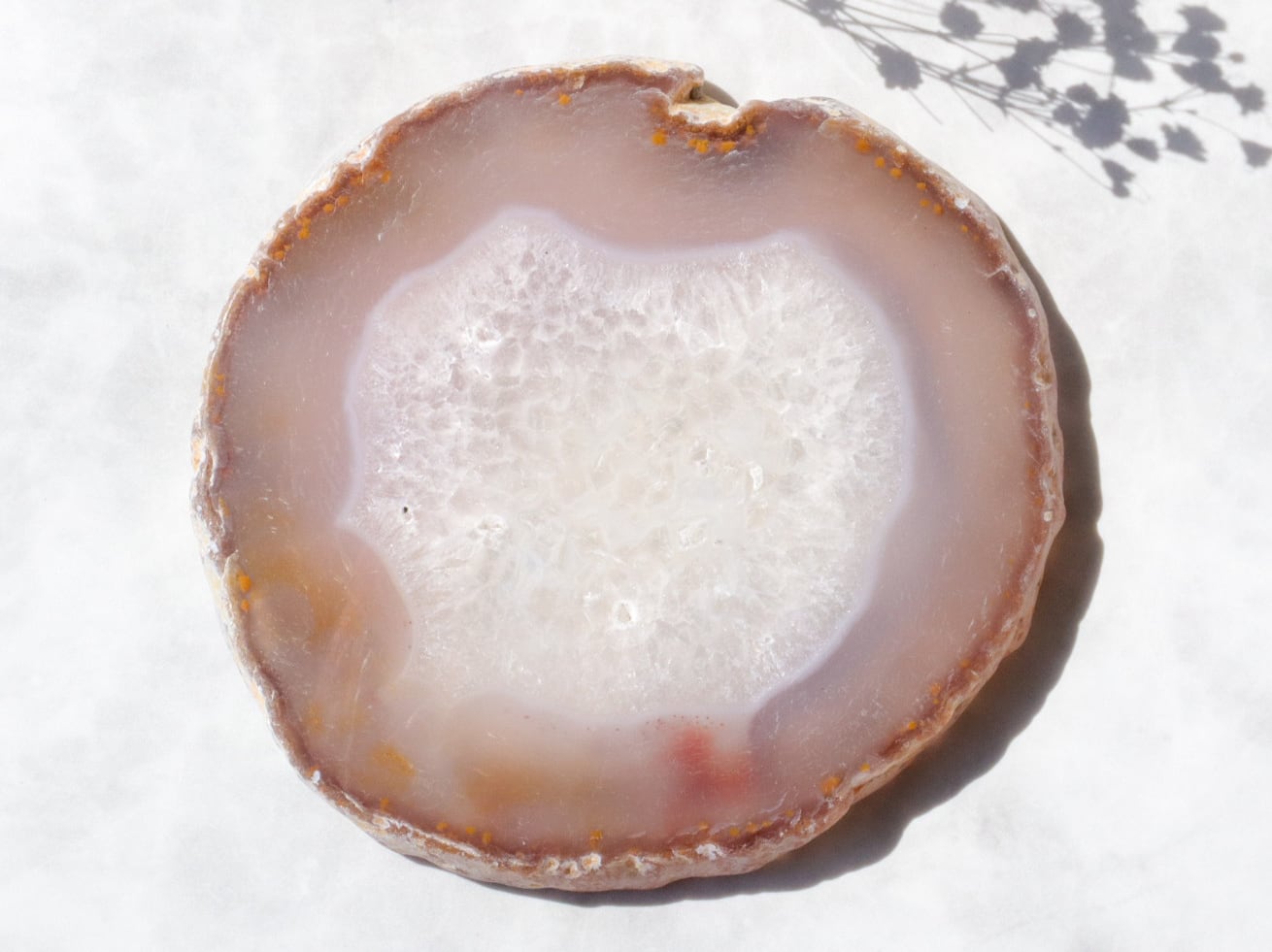 真ん中が白くてザクザクの瑪瑙プレートのご紹介です✨パープルやグレー、ブラウンともつかない落ち着いたお色は、上に乗せるものの邪魔をしないシンプルかつおしゃれなプレートだと思います♡♡♡場所によって、黄色や、オレンジのような箇所もあり、ナチュラル感満載です✨プレートの縁もなんだか切り株のようで可愛いです♡重さと大きさのわりにはお安いと思います✨✨