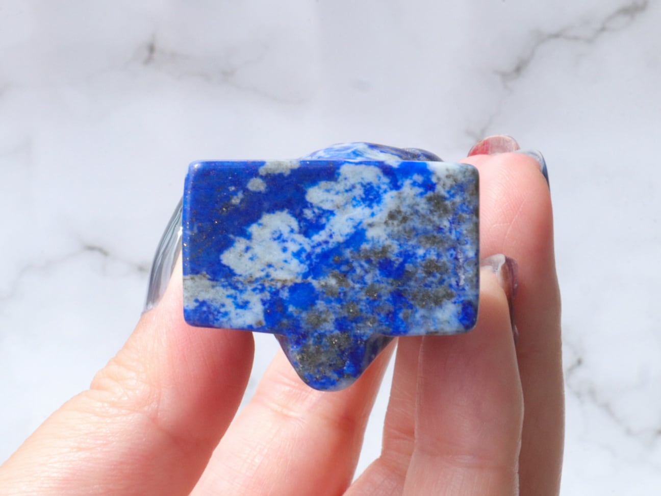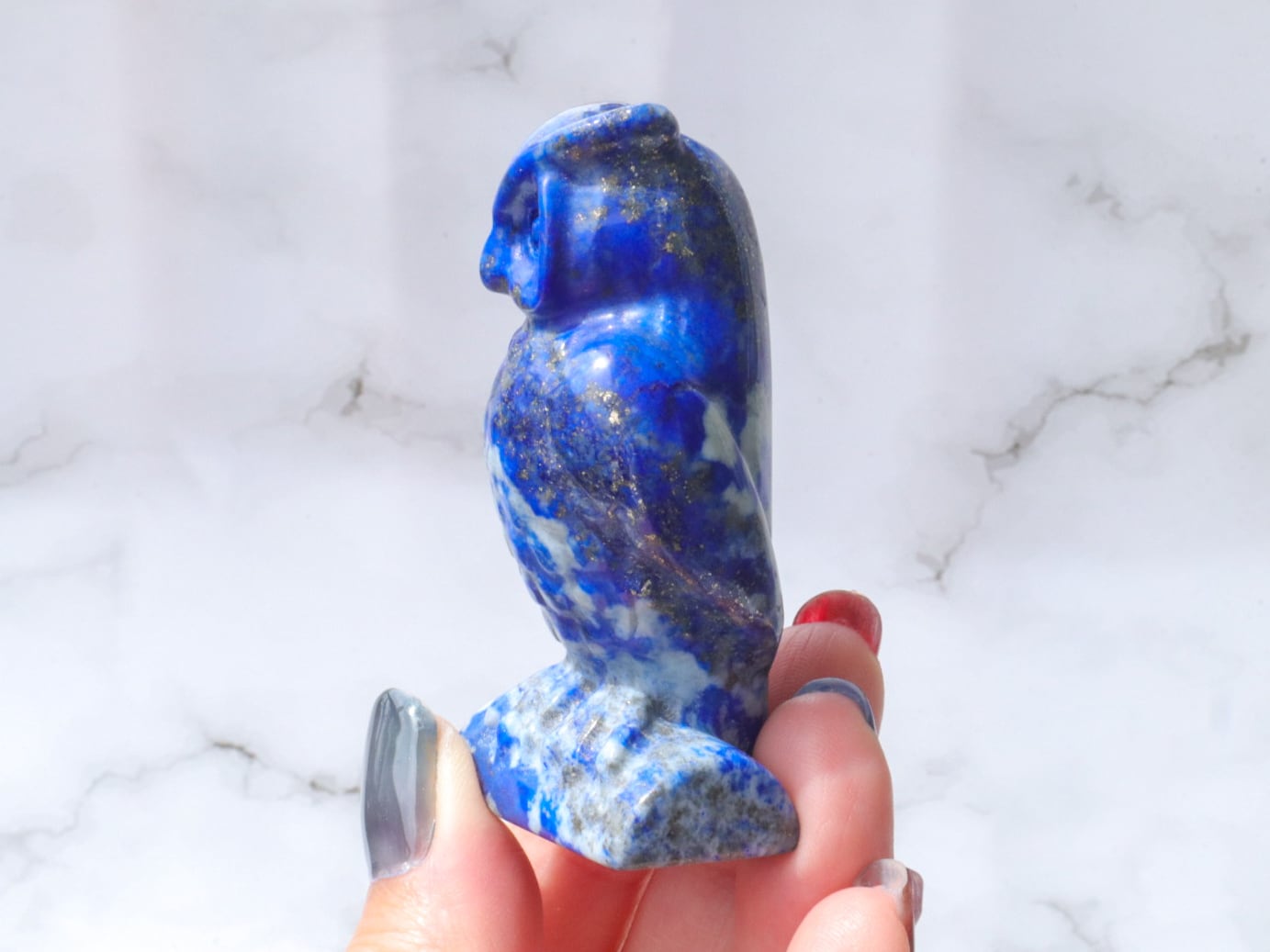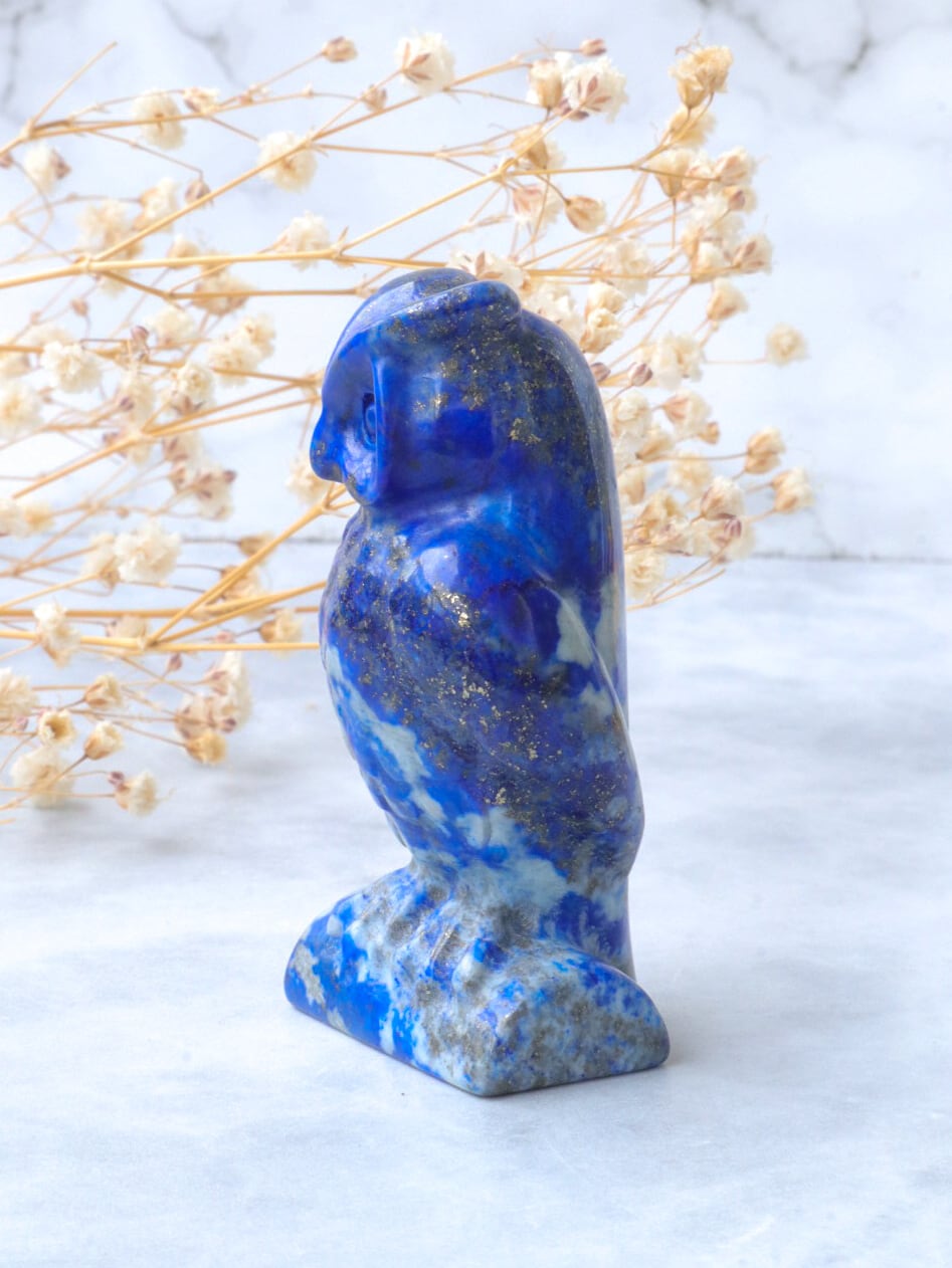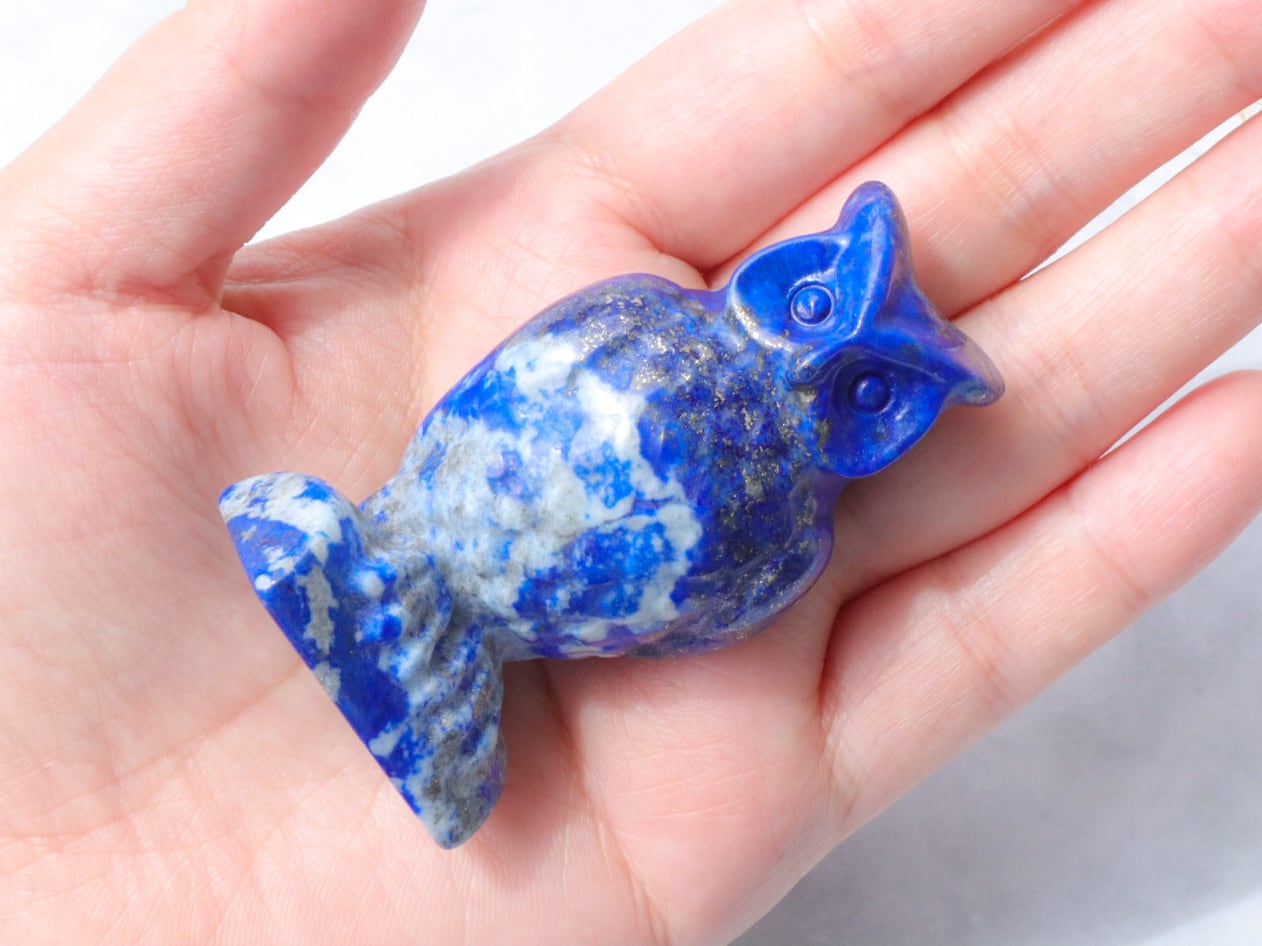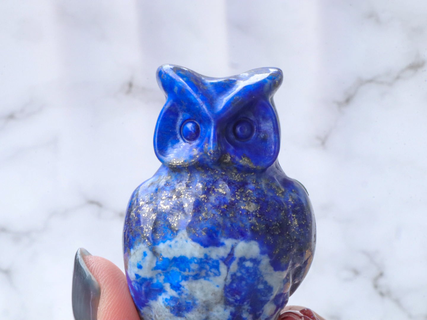 鮮やかなブルーが美しいラピスラズリのフクロウさんです☆彡ゴールドのパイライトが、まんべんなく全体に入っていてキラキラします✨凛とした表情と佇まいが美しく存在感のあるこです✨✨