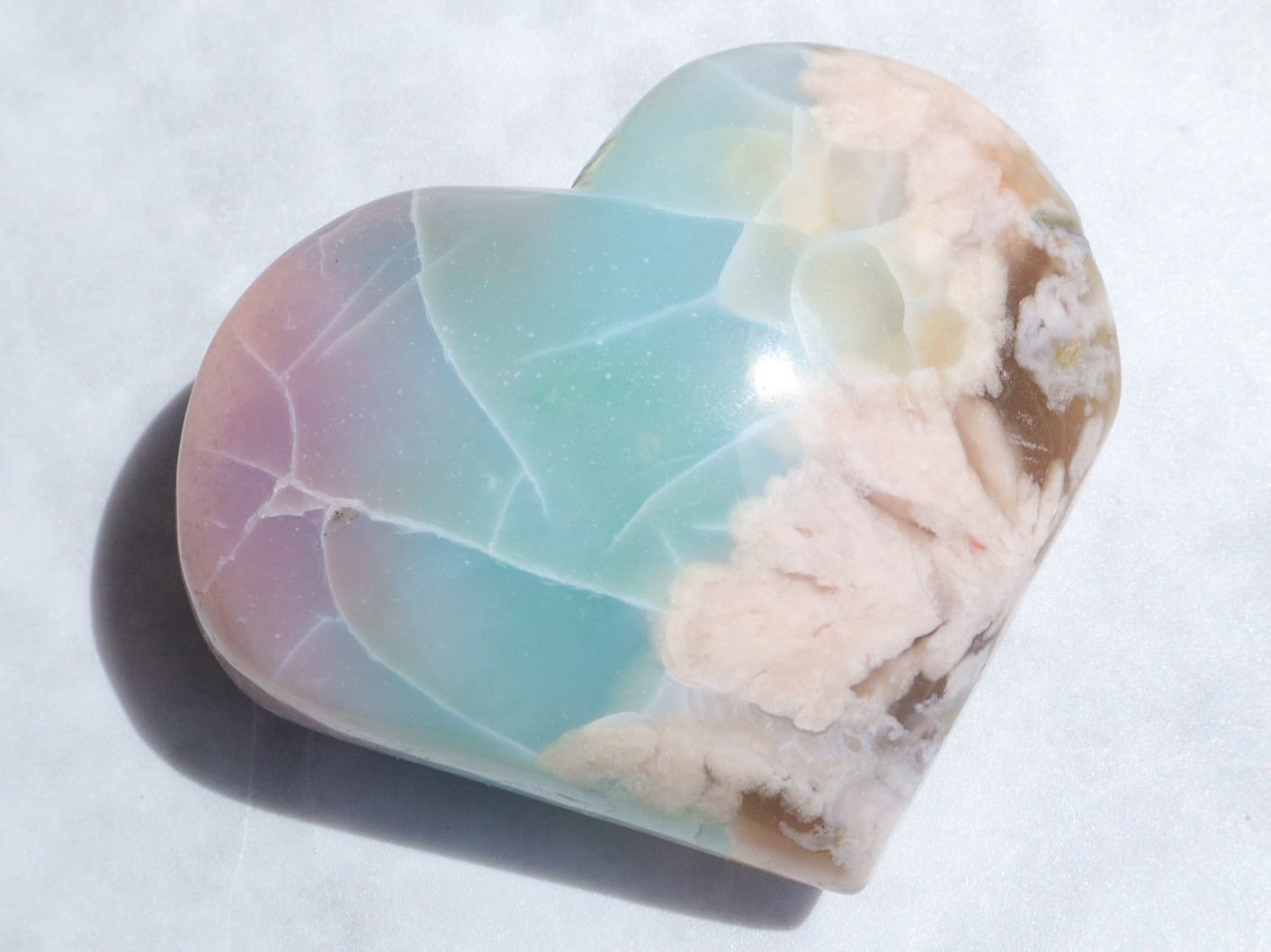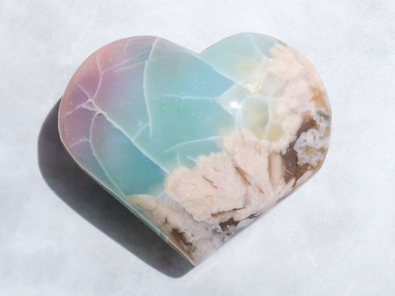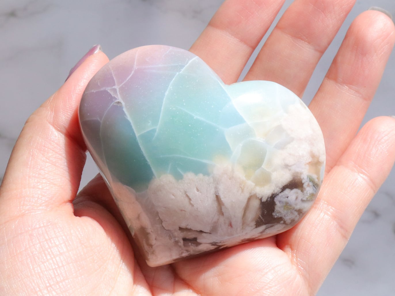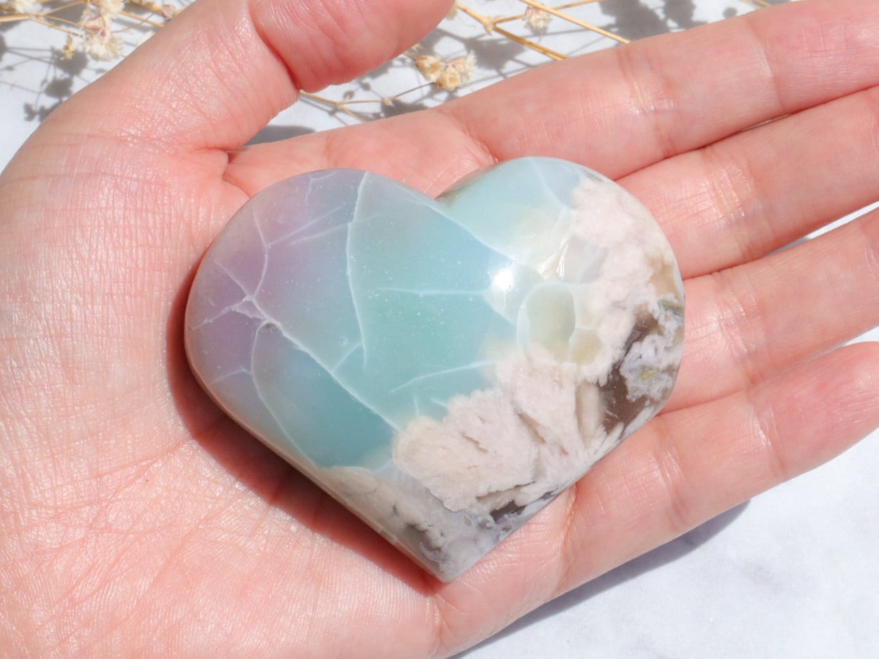 桜瑪瑙の中でもとても希少で、人気の高いグリーン桜瑪瑙さんがまた再入荷しました♡今回もハート型でグリーンというよりも、薄いブルーにも近い美しい色をしています✨ブルーグリーンの箇所に入った葉脈のような模様は、まるで海面の波模様のようにも見えます✨そこに大きな花柄とベリーピンクがグラデーションを帯びて入った、大変貴重なこです♡かなりの私物案件でした(人´ω`*)♡