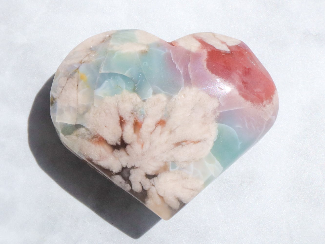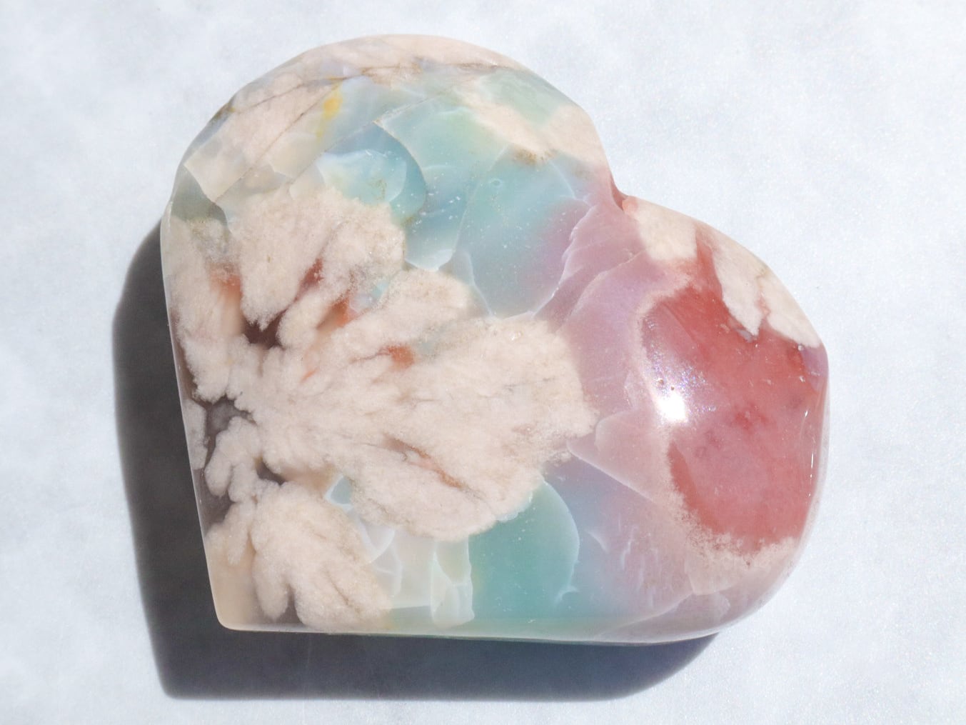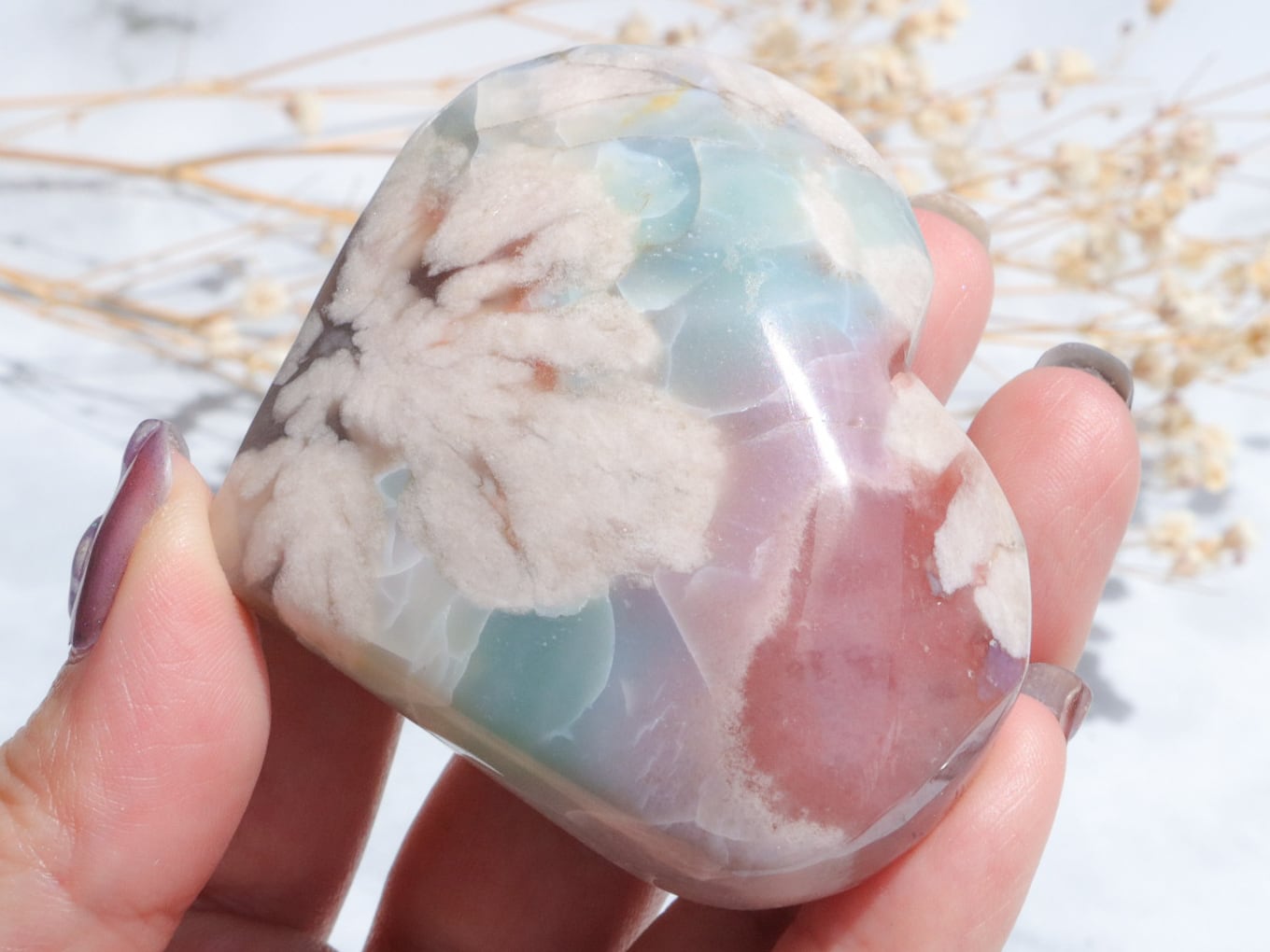 桜瑪瑙の中でもとても希少で、人気の高いグリーン桜瑪瑙さんがまた再入荷しました♡今回もハート型でグリーンというよりも、薄いブルーにも近い美しい色をしています✨ブルーグリーンの箇所に入った葉脈のような模様は、まるで海面の波模様のようにも見えます✨そこに大きな花柄とベリーピンクがグラデーションを帯びて入った、大変貴重なこです♡かなりの私物案件でした(人´ω`*)♡