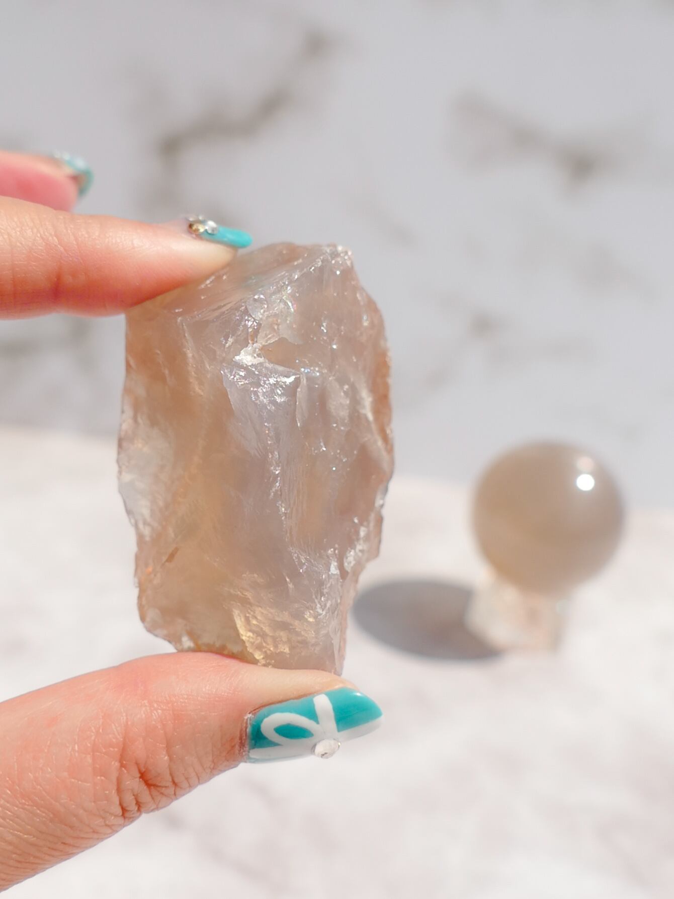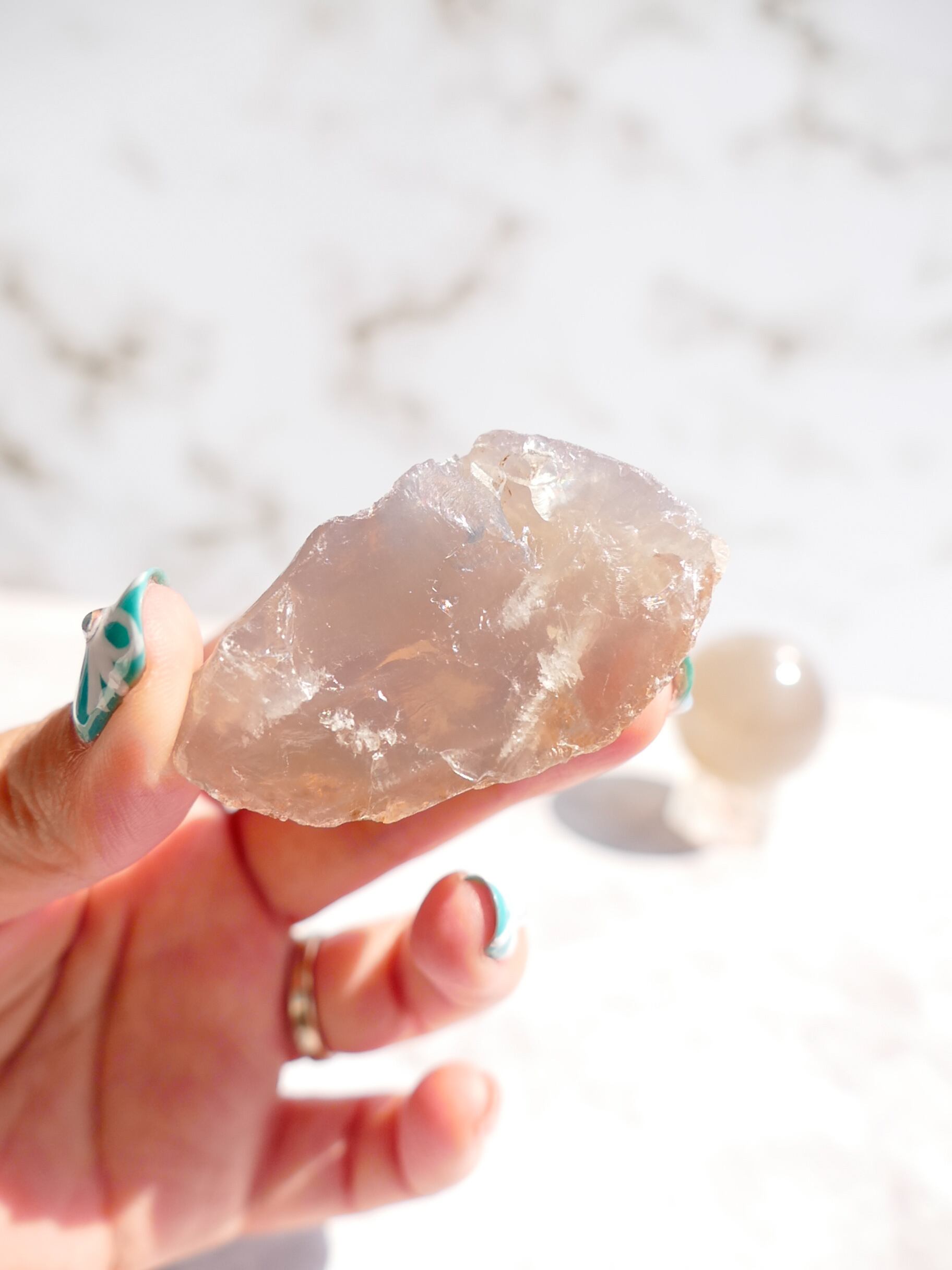 原石ですし、虹のでにくいローズクォーツに、虹がたくさん散りばめられた希少なこです✨✨透明感もあって、写真の奥に写っているブルーローズのスフィアにひけをとりません✨