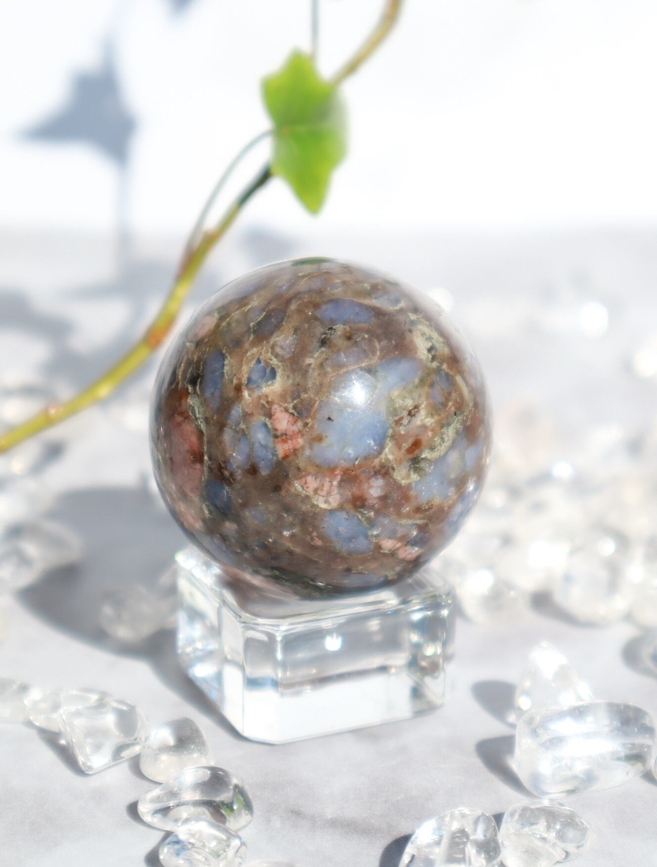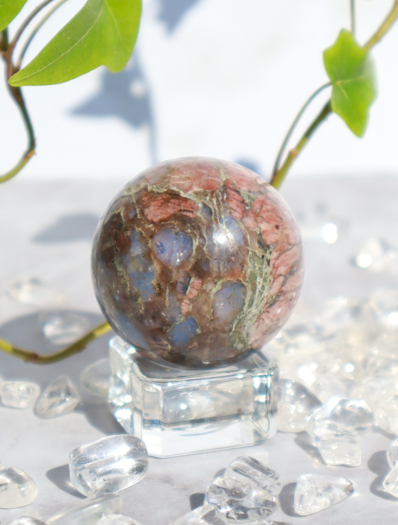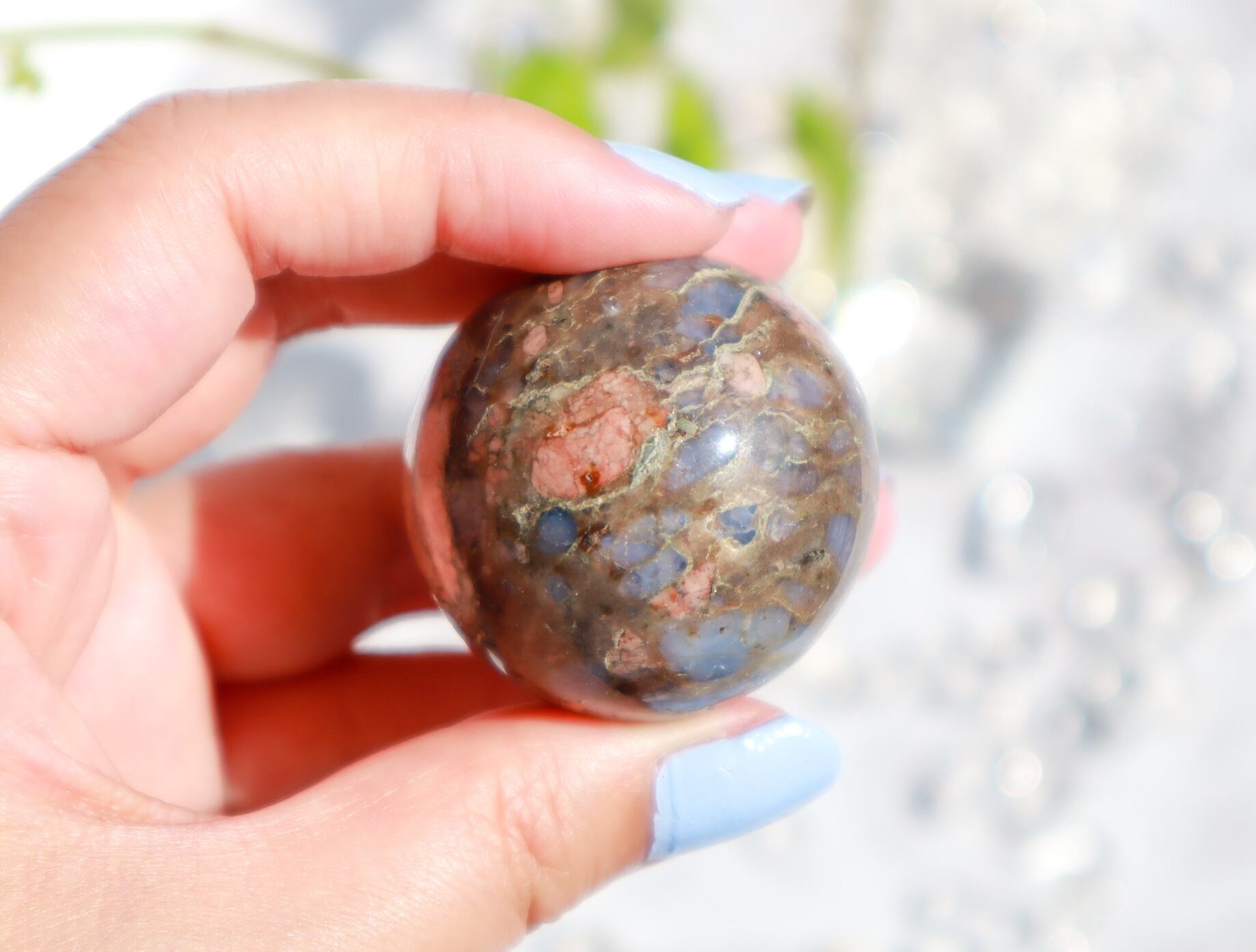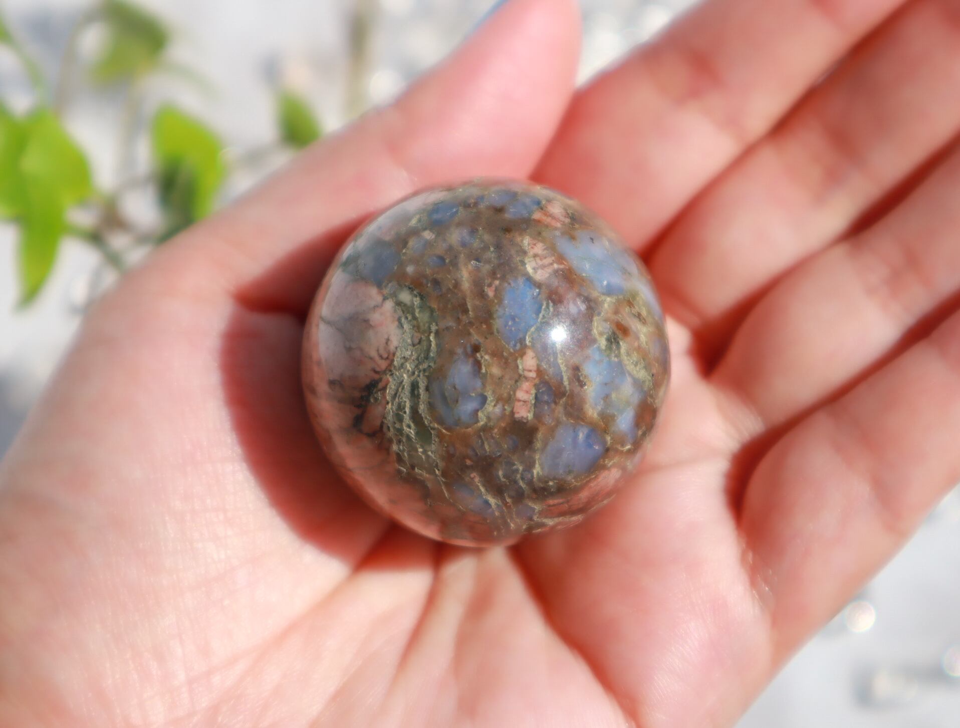 混合した石によって、様々な色合い・模様が見られます♡このこはピンクの面が多くとっても可愛いらしいこです♡ブルーオパール部分も多く光を当てるとキラキラして癒されます✨✨
