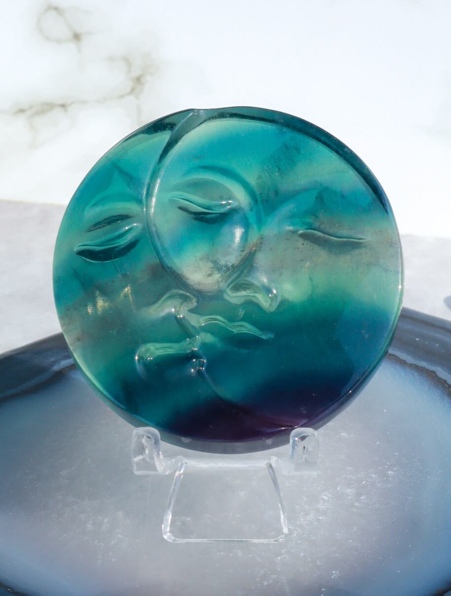 このこは、海のように澄んだブルーグリーンを基調として、紫のラインなども入った幻想的な太陽とお月様です( *´艸`)✨つるっとテカっとしていて透明度もあり、私は初見で思わず美しい、、、といってしまいました✨ブルーフローライトは他のカラーのこたちより、重さもあり、希少価値も高いため、あまり出回らず、お値段も少し高めですが、この美しさは、手にした時に改めて価値を知ると思います✨✨