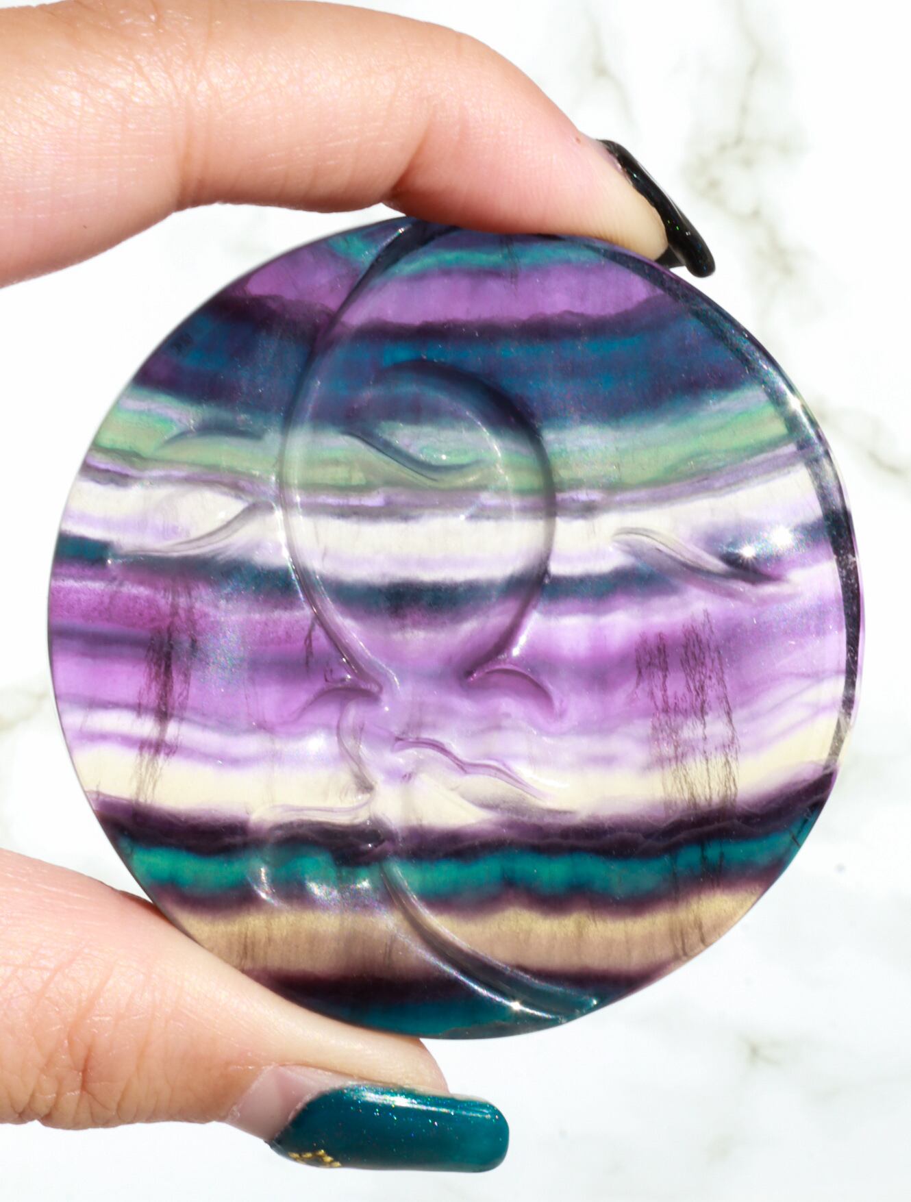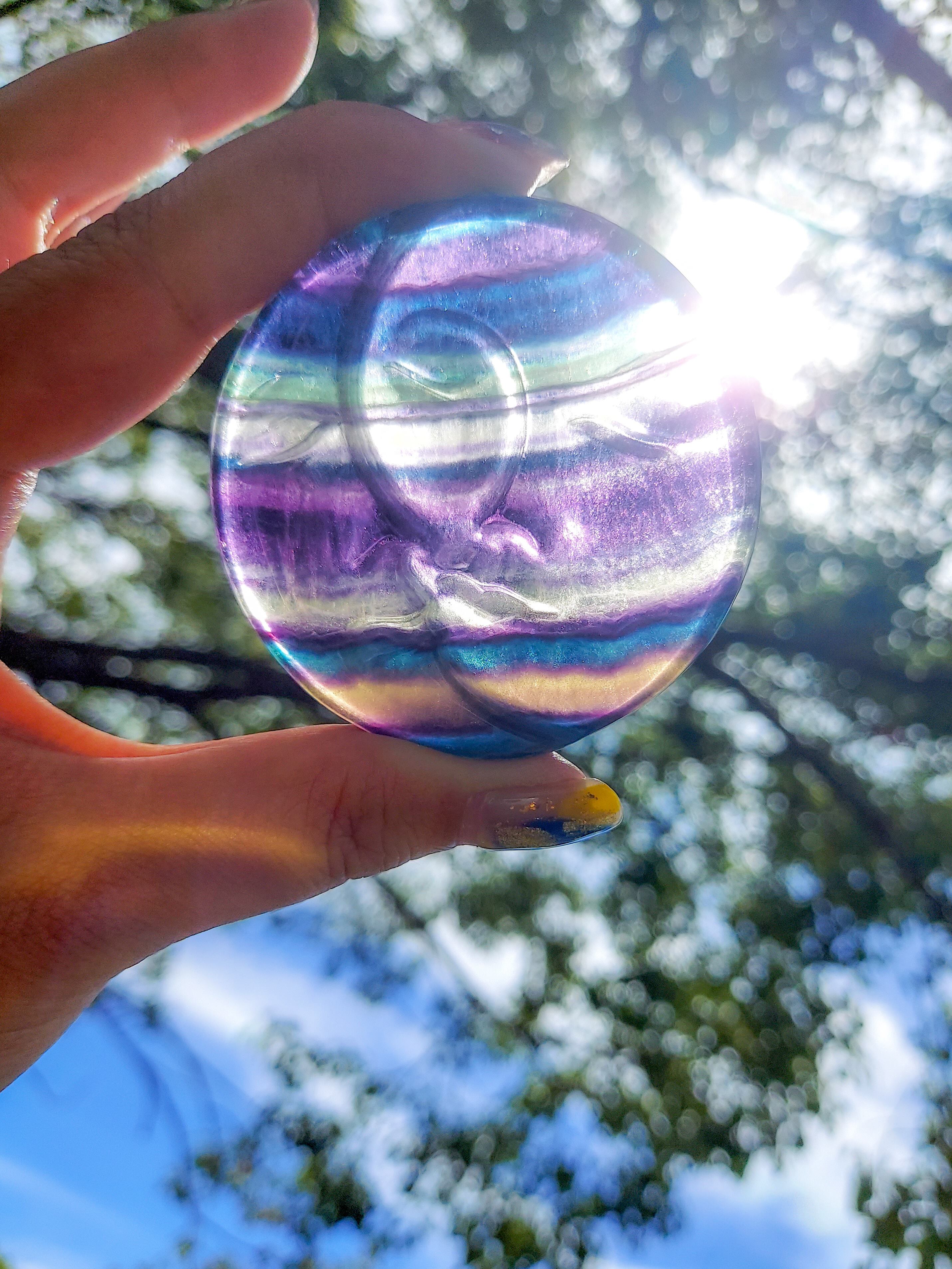 このこは、青や緑、紫や黄色のラインが入り、フローライトの良いところをいっぺんに楽しめる太陽とお月様です( *´艸`)✨つるっとテカっとしていて美しく、手にピッタリフィットして瞑想などにもご利用頂けると思います♡