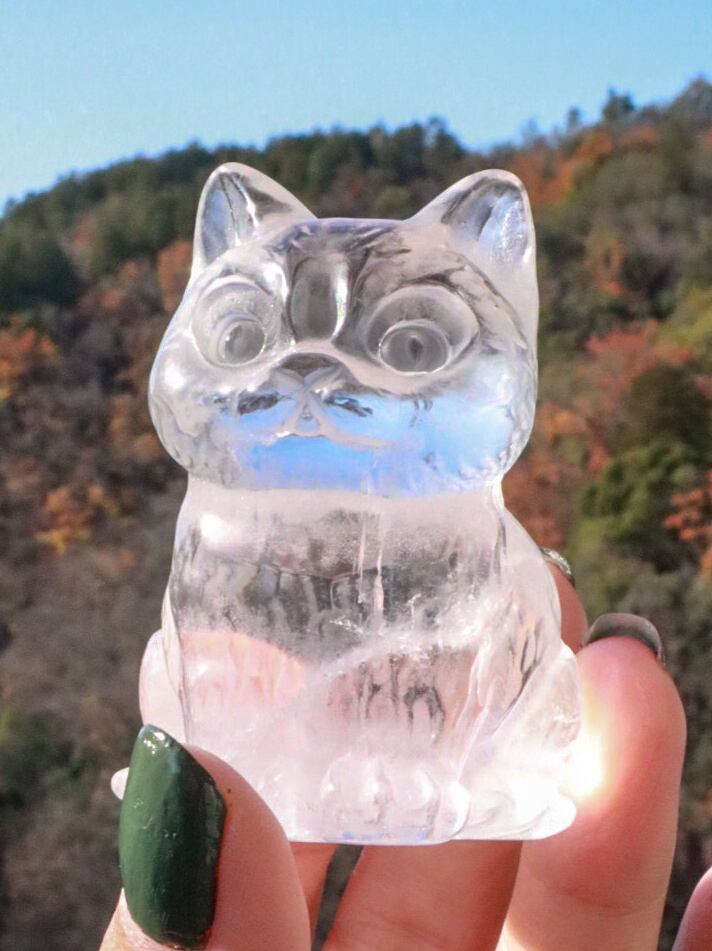 クリアクォーツのぷっくりフォルムの可愛いねこさんです♡見た目もエネルギーも透明感のあるこです✨✨愛らしいお顔や後ろ姿♡毛並みまで再現された詳細な彫りが見所のねこさん♡玄関や寝室などで、可愛く皆さんをお出迎えしてくれます♪是非お手元へ♡