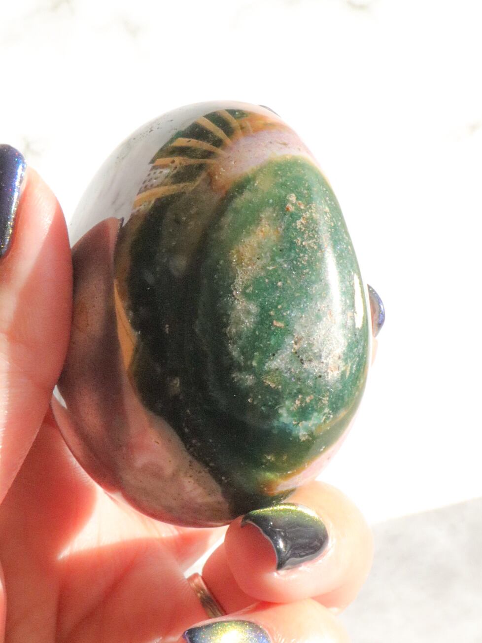 オーシャンジャスパーは海岸で採掘されたことからオーシャンの意味をその名に付けられたとされています✨まだら模様にも見える柄は1つの絵画のようにも見受けられます✨このこはオーシャンジャスパーで特に人気のピンク系ストーンです♡グリーンとベージュが入ってて、キラキラのドゥルージー部分もあります✨✨コロンとしていて手のひらにピッタリと馴染むこです✨✨✨