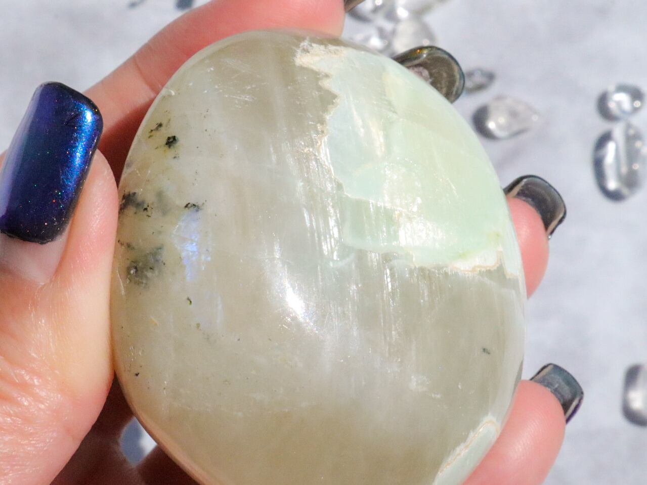 色合いは、パステルイエロー、パステルグリーン、ミントグリーン、淡く美しい印象の石です。ニッケルの含有量が多くなると濃い緑色になります✨