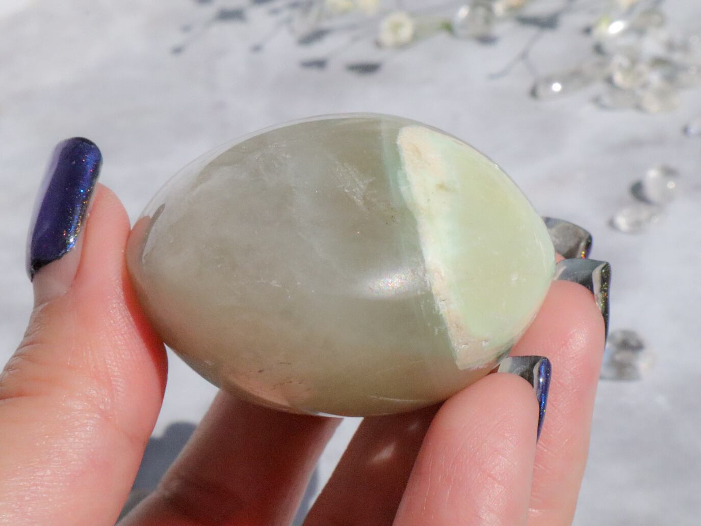 色合いは、パステルイエロー、パステルグリーン、ミントグリーン、淡く美しい印象の石です。ニッケルの含有量が多くなると濃い緑色になります✨