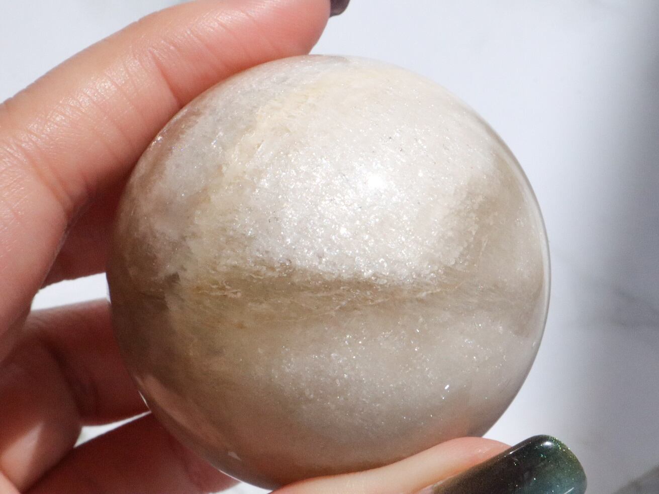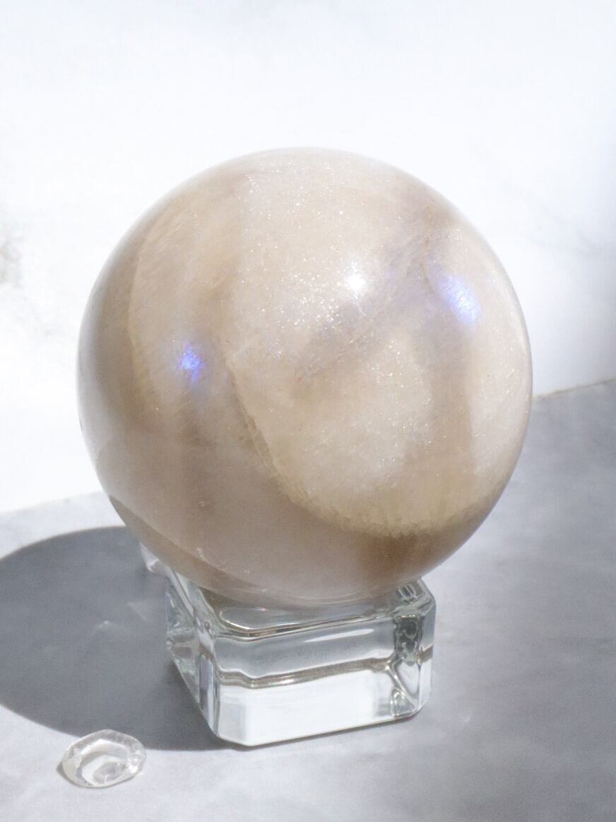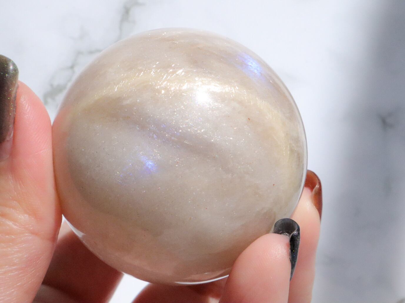 なんとも美しいブルーシラーや、虹シラーがあちこちに輝く、とっておきのブルームーンストーンのスフィアをご紹介します♡