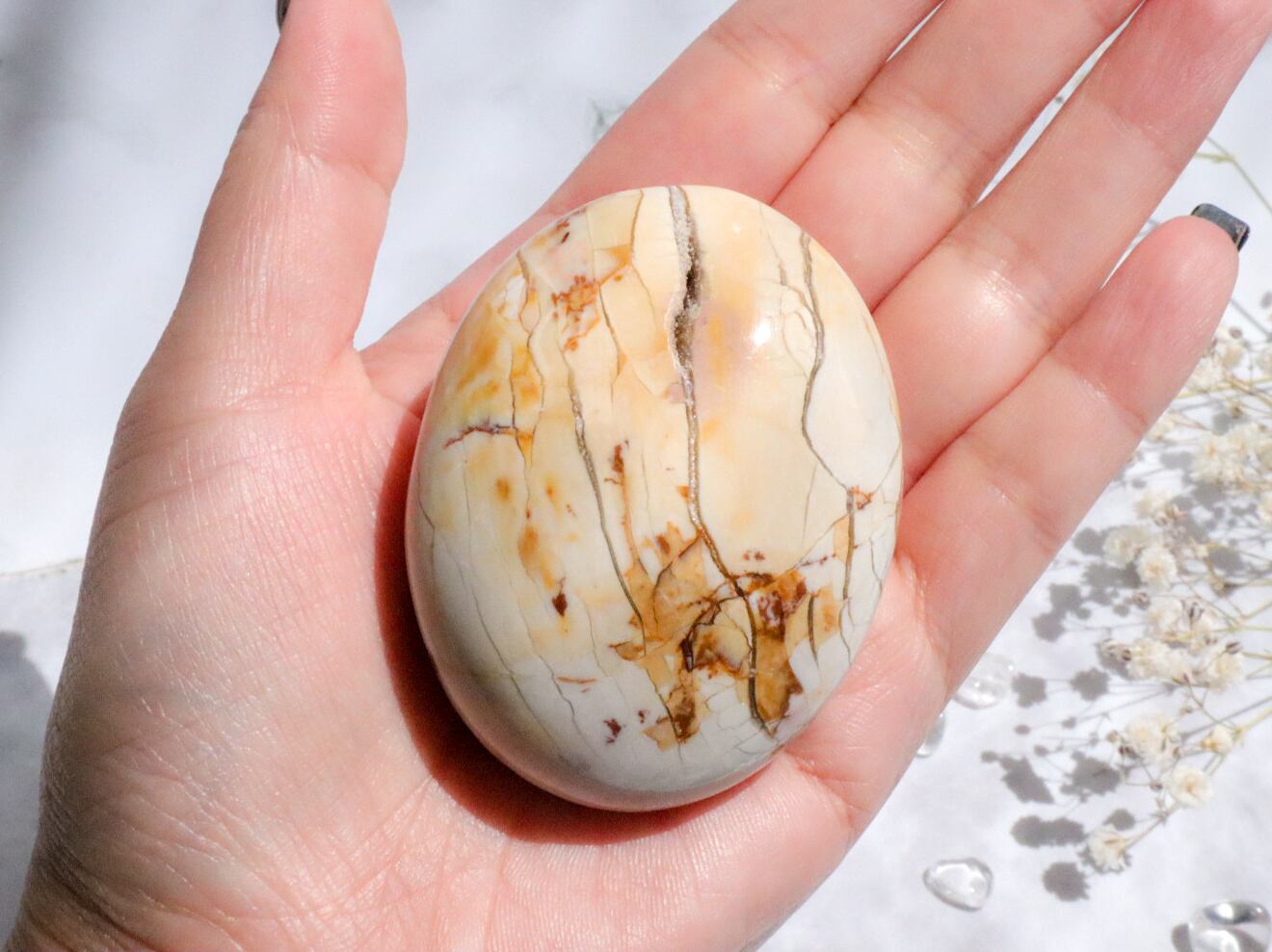 鉱物たちがパズルのように重なり合って、まるで絵画のように美しい模様を作り出しています♡その間にはクォーツの透明感あり、ドゥルージーのキラキラ感もあります。表面はツルッとしていて肌馴染みも良く、握ると安心感すら感じます✨