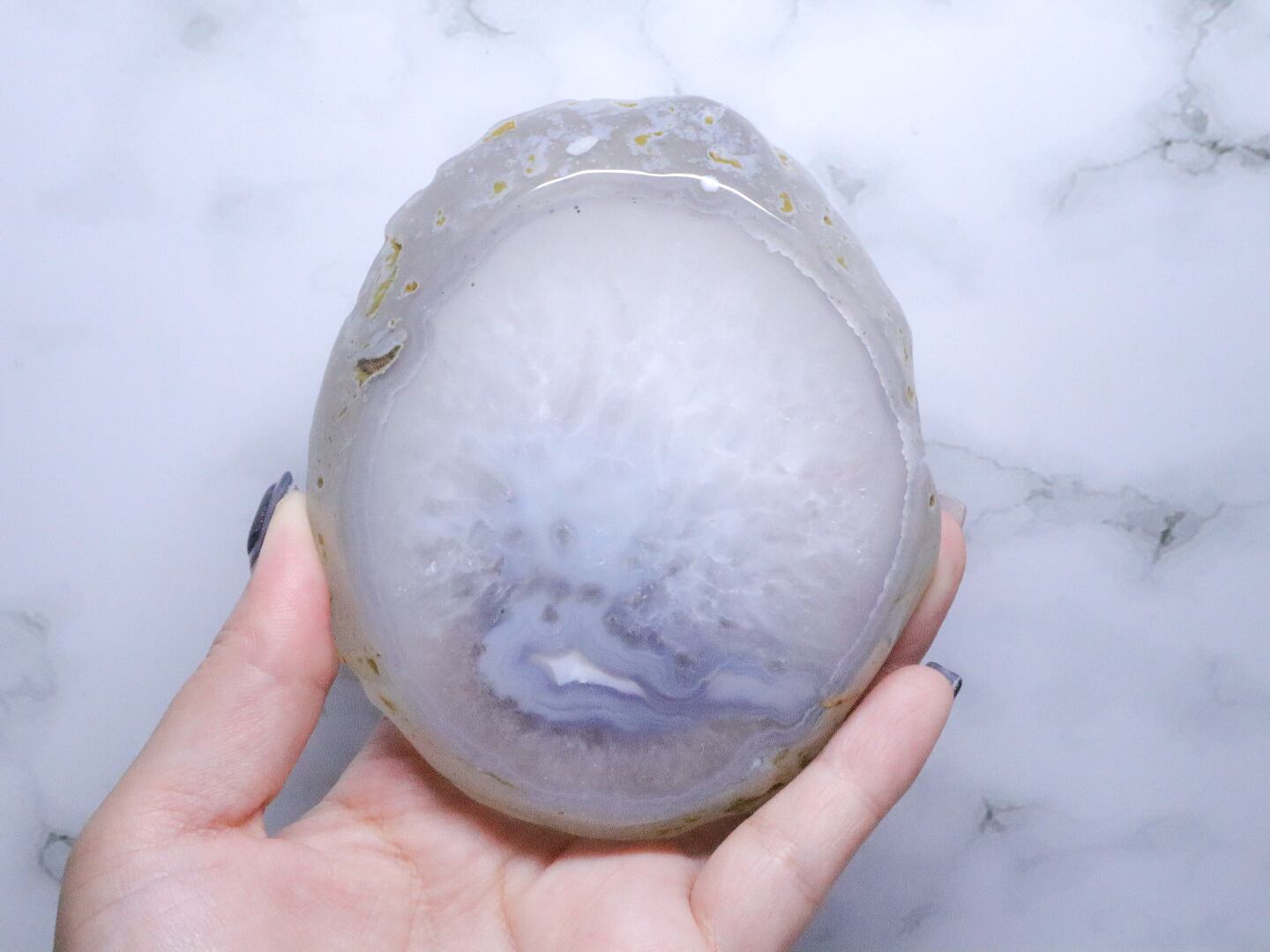 瑪瑙(メノウ)、アゲートは、実にさまざまな色や模様を持つ石です♡これは世界各地に産地があり、それぞれに模様などの傾向があることや、多孔性を活かした染色も関係します✨染めのない瑪瑙は光りによってはグレーが薄いブルーにも見えます✨このこは染めなしのこです♡
