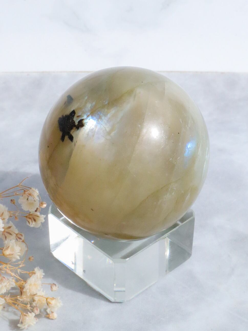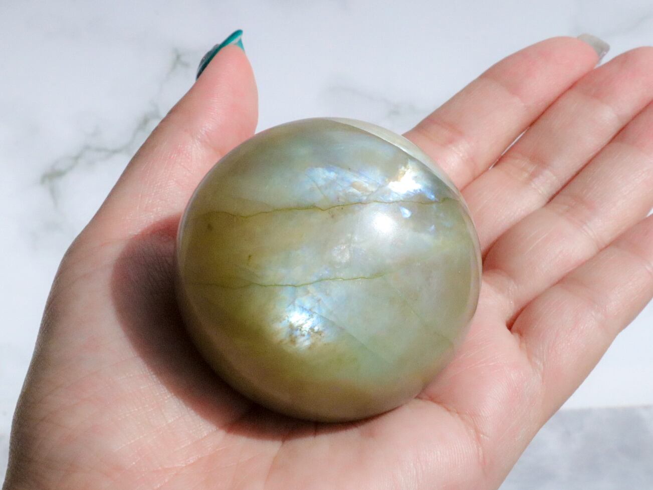 おそらく真球(意味:完全な球体)ではなく、柔らかみと可愛らしさを感じるような、少し潰しぎみの球体かなと感じます。実際には固いですが、ガーニエライトは衝撃に弱いのでお気をつけください。