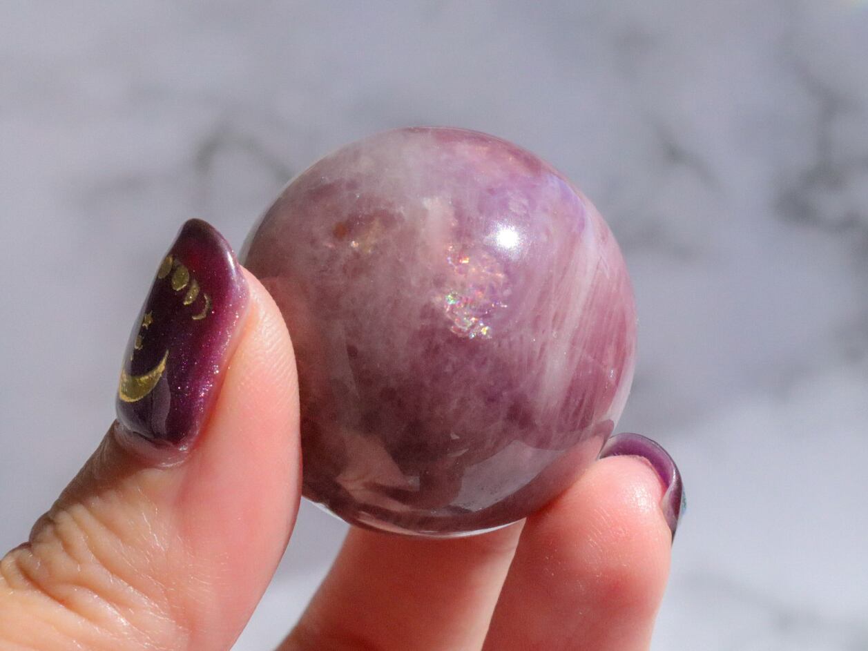 文字通り、薄紫がかったラベンダーローズクォーツと呼ばれるお石さんです♡この色は希少性が高く、少しお高めですが、ラベンダーローズクォーツにしかない色の可愛さも魅力♡♡♡澄んだ赤紫色の奥に虹が輝き、まるで水面(みなも)のように波打つようなシラーが見られます!!是非動画でチェックしてください♡