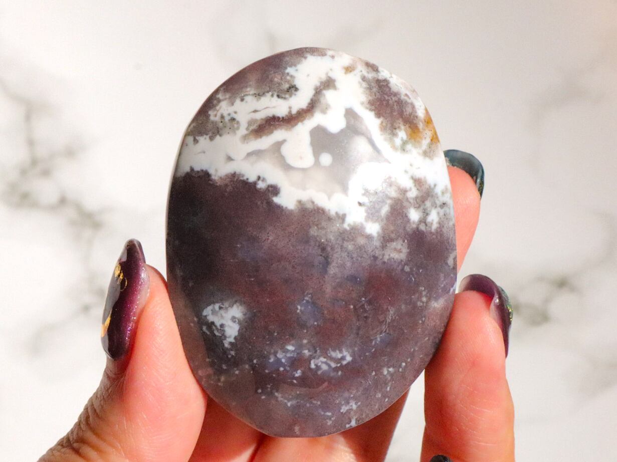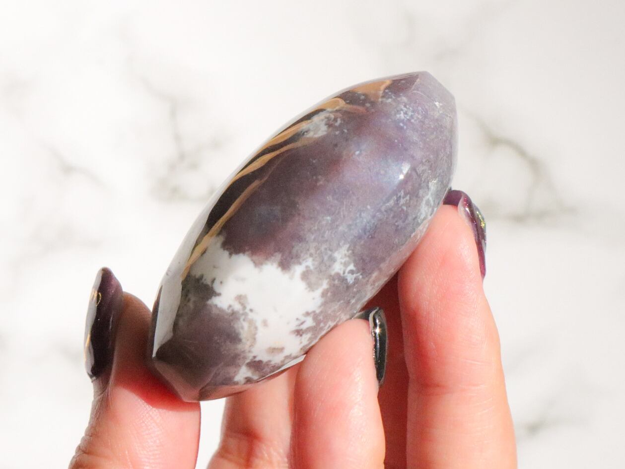オーシャンジャスパーは海岸で採掘されたことからオーシャンの意味をその名に付けられたとされています✨まだら模様にも見える柄は1つの絵画のようにも見受けられます✨このこは、オーシャンジャスパーで特に人気のピンク系ストーンです♡全体的に透け感のあるピンクモスアゲートのようなこです♡白く透けた箇所に見られるキラキラした特徴的な柄はかなりのチャームポイントです♡コロンとしていて手のひらにピッタリと馴染みます♡♡♡