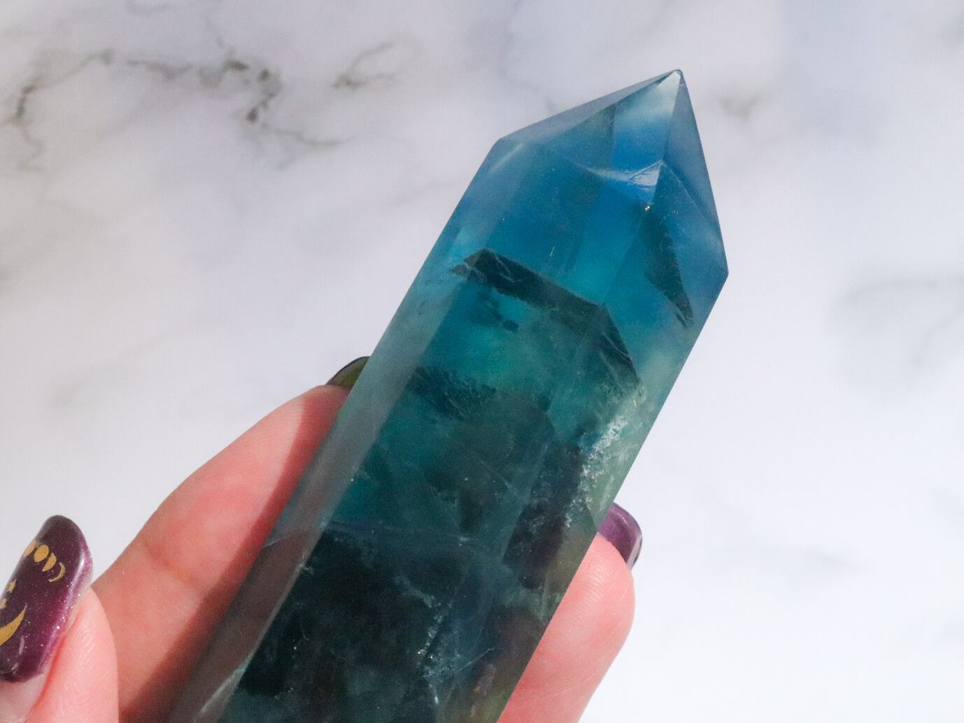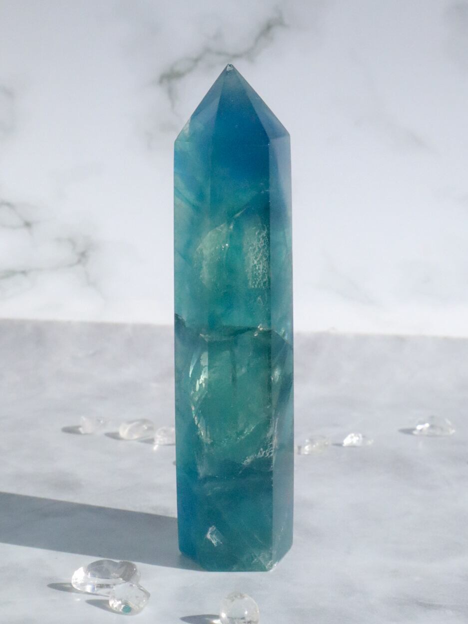 ブルーフローライトは他のカラーのこたちより、重さもあり、希少価値も高いため、あまり出回らず、お値段も他の色より少し高めですが、この美しさは、手にした時に改めて価値が解ってもらえると思います✨混ざりもののない、とにかく美しいブルーフローライトポイント✨是非お手元で確かめて頂きたいです♡