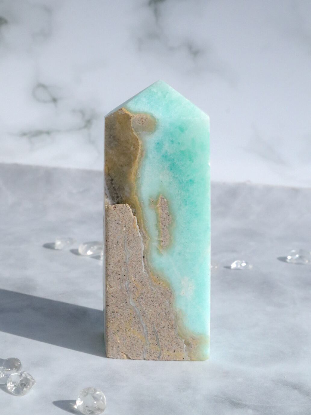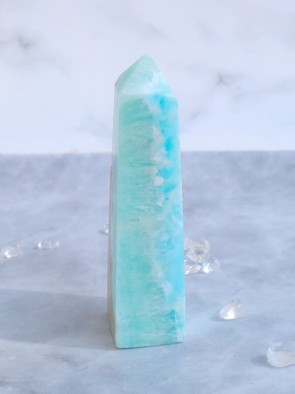 ブルーアラゴナイトは水色の層が幾重にも重なった美しい天然石で、「エネルギーの浄化をおこなう」という石言葉を持っています。