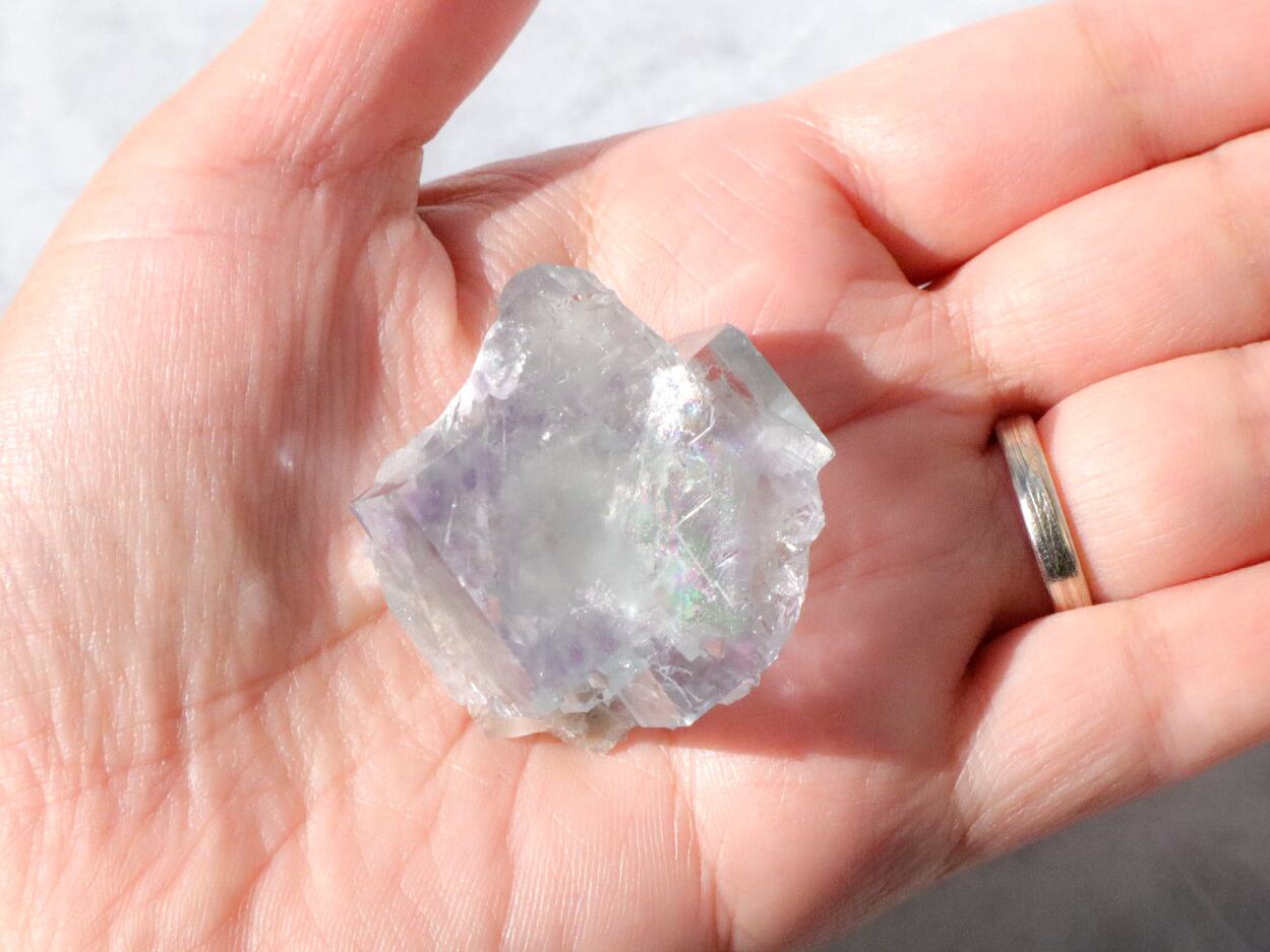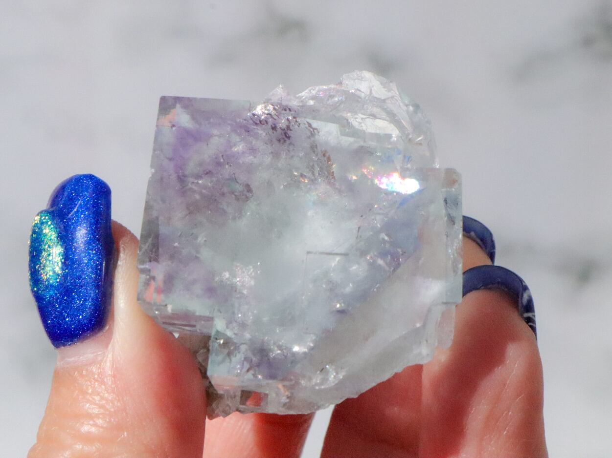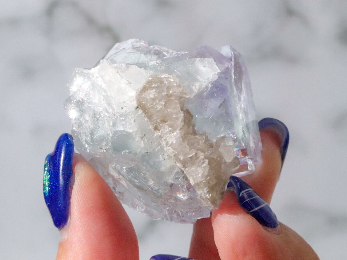 このこもとても透明度がよく、くすみブルーにパープルがモヤっと一部に入った神秘的なこです✨✨キューブの形も見事に残り、表面は幾何学模様の段差が出来ています。少しキューブの角に欠が見受けられますので、それも個性と思って受け入れてくださる方にお迎え頂きたいです✨動画でもしっかりとご確認ください。
