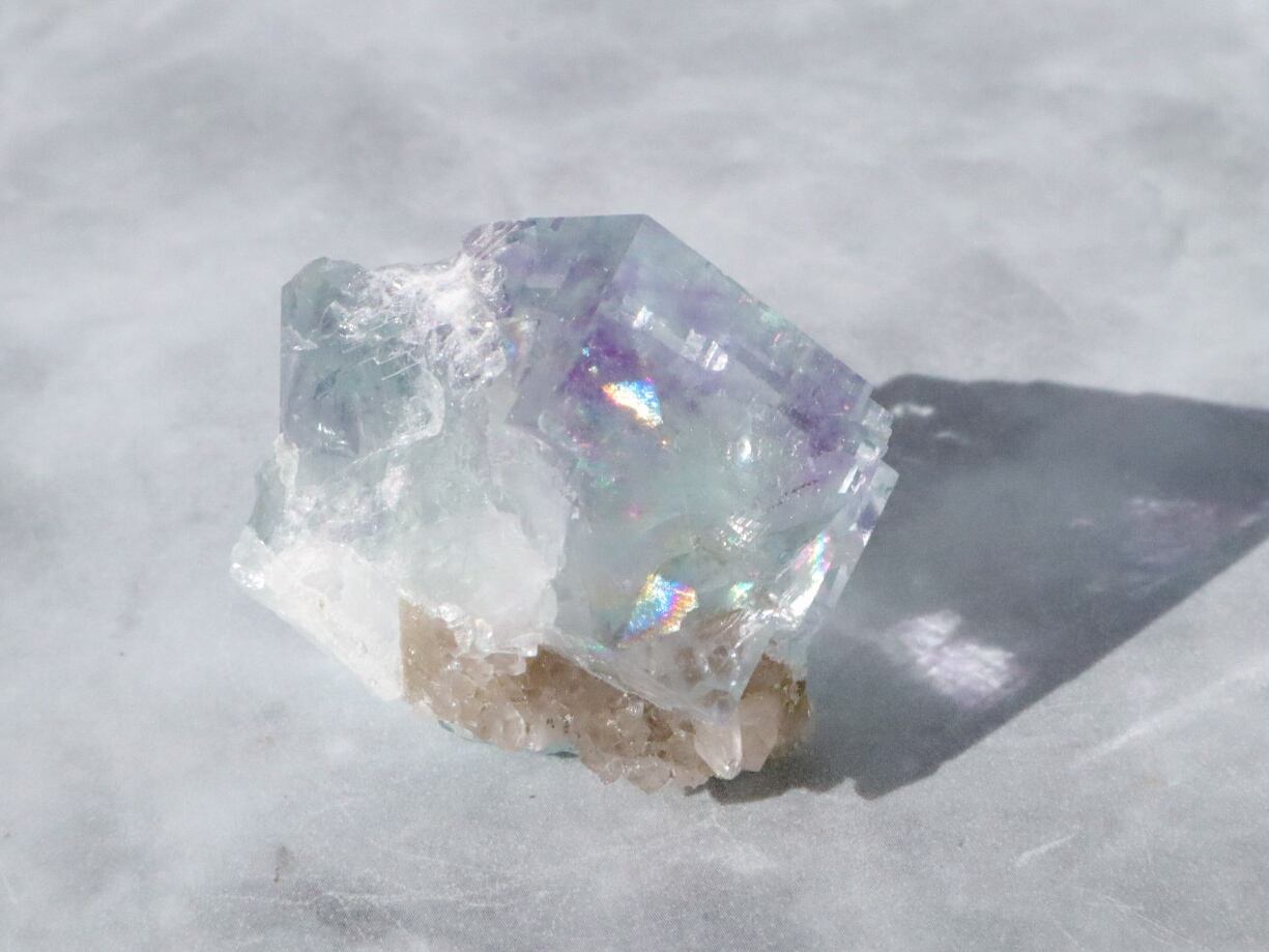 キューブの裏にはおそらく水晶だと思われるクラスター状のものが共生している珍しいこで、見ごたえじゅうぶんです✨✨透明度の中には美し過ぎる大きな虹も輝きます✨✨キューブの、裏側部分にも虹をみることの出来る贅沢な逸品です♡