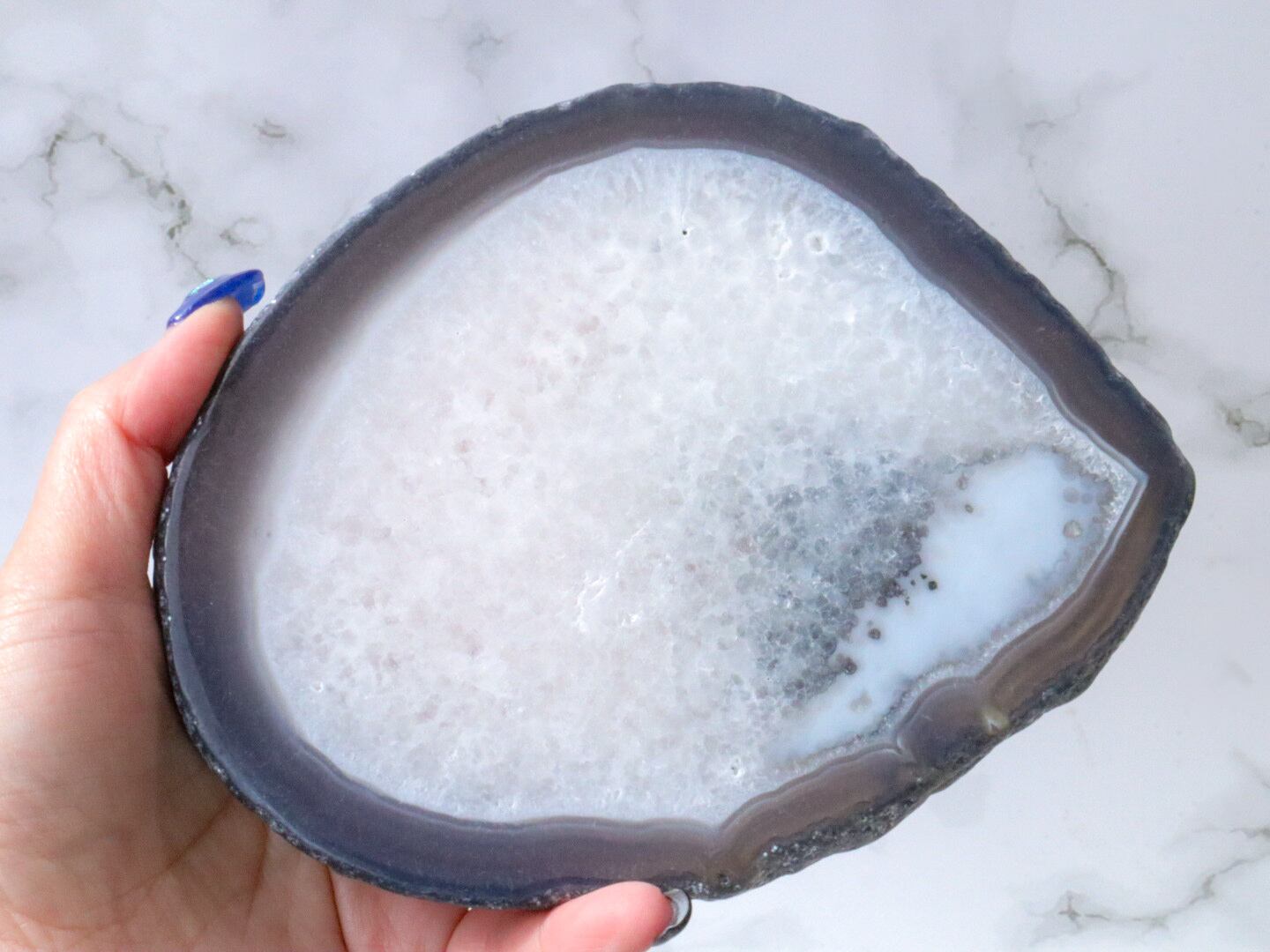 真ん中が白くてザクザクの瑪瑙プレートのご紹介です✨ザクザクの面はドゥルージーの穴がいくつかありますが、キラキラして虹も見えます♡このこはブルーグレーなので、上に乗せるものの邪魔をしないシンプルかつおしゃれなプレートだと思います♡♡♡厚みもあるので、ある意味存在感があって、色んなディスプレイの仕方にイメージが膨らみます♪