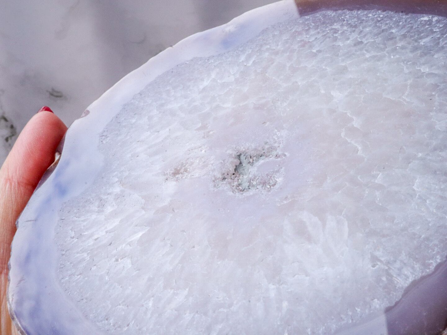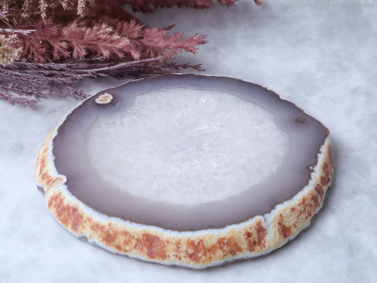 真ん中が白くてザクザクの染めがないナチュラル瑪瑙プレートのご紹介です✨このこは片面がブラウン系の色味に見え、もう片面はパープルブルーの色味に見えます✨シーンや、置く場所によって使い分け可能♪片面には真ん中にキラキラのジオードの凹みが出来ています。縁のところは、まるでこんがり焼けたパンのミミみたいで、可愛いです♡色んなディスプレイの仕方にイメージが膨らみます♪