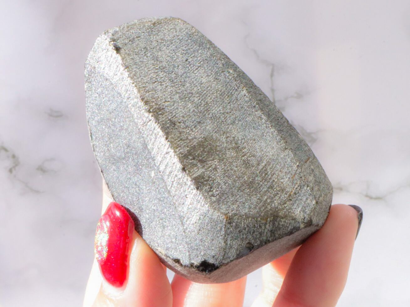 このこは半分は磨かれていて、ツルッとしているのでゴールドシラーがよく見えます✨✨もう半分は切り出されたままで磨きがありませんのでマットな感じですが、ツルッとした方の真裏を太陽光の下でみると、キラキラ光り、ゴールドの輝きもかすかに感じることが出来ます♡是非そちらも楽しんでみてください✨✨