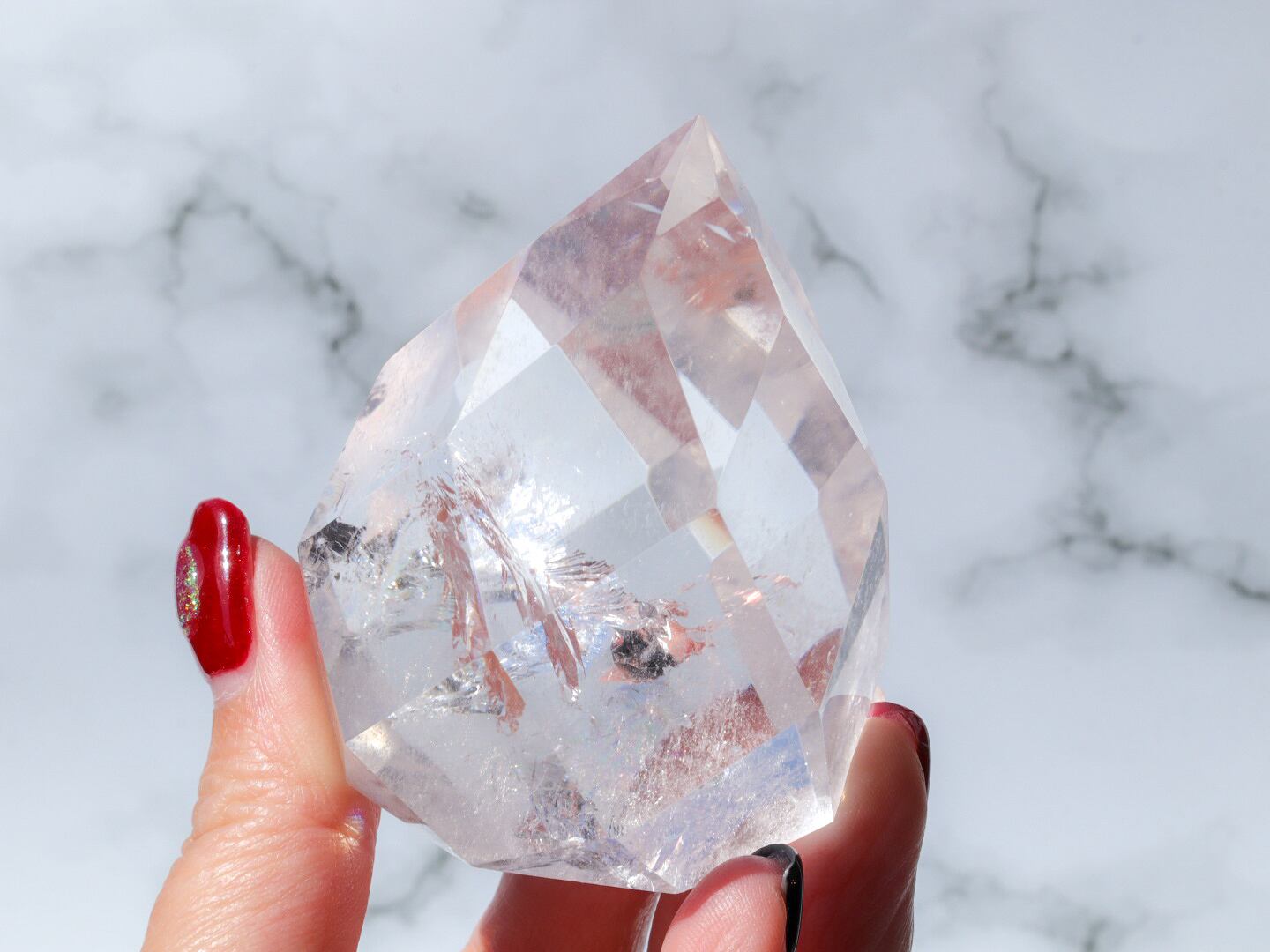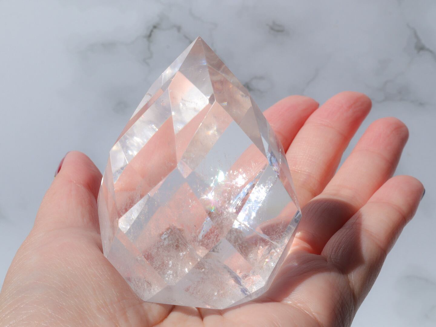 透明感あり、ゴリゴリの虹ありの美しい水晶に、いくつものカットが施された見事な形✨✨カットが多いので、光を反射してサンキャッチャーのような役割もしてくれます✨どのような場所にどのように配置するか、考えるのもワクワクですね♪