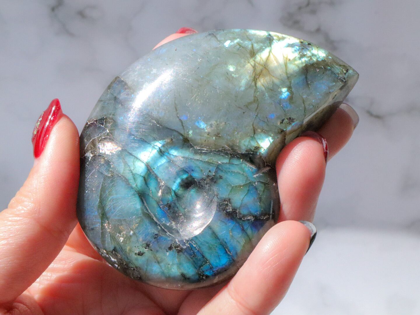 アンモナイトの形をしたラブラドライトさんのご紹介です✨✨両面個性的な光を放つこです✨形も相まって石の歴史を感じます✨