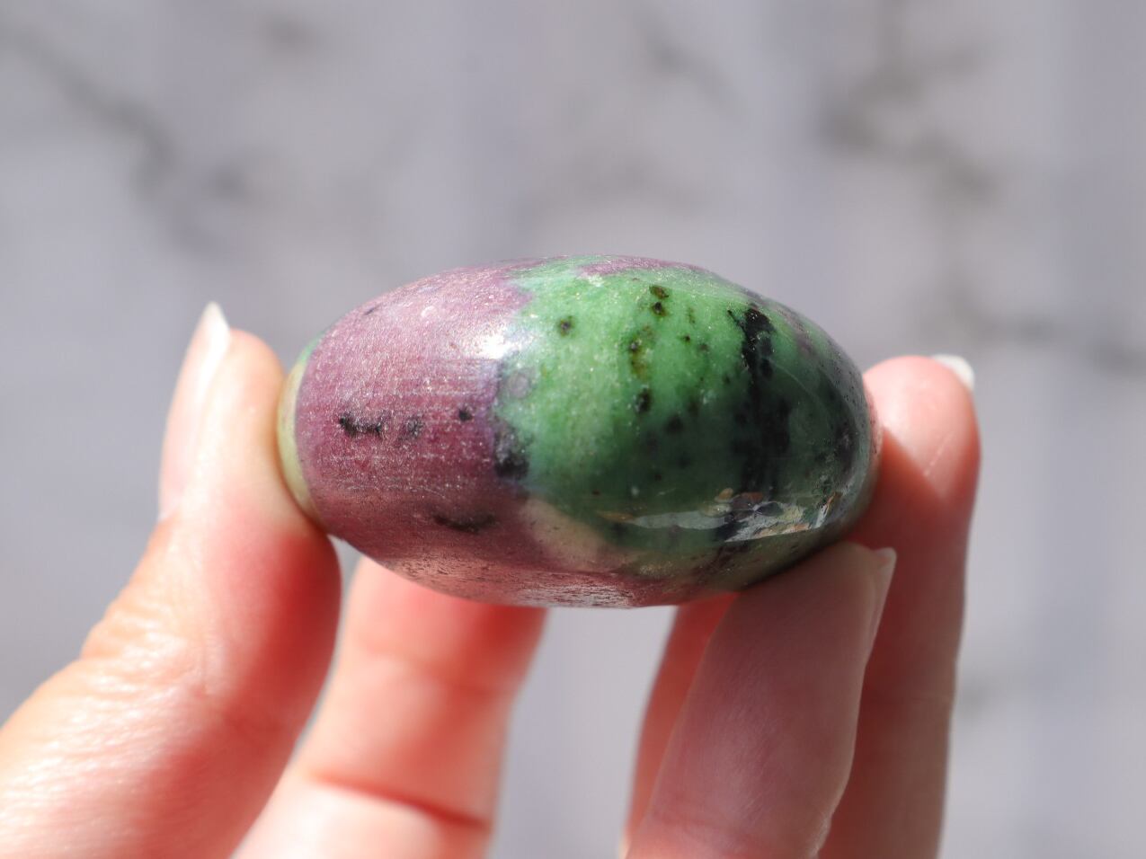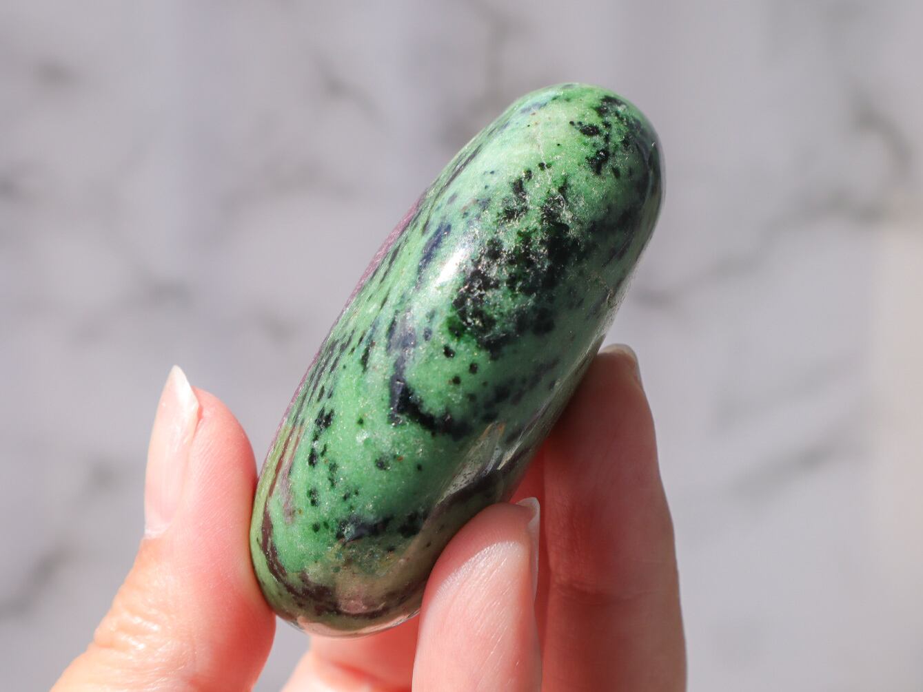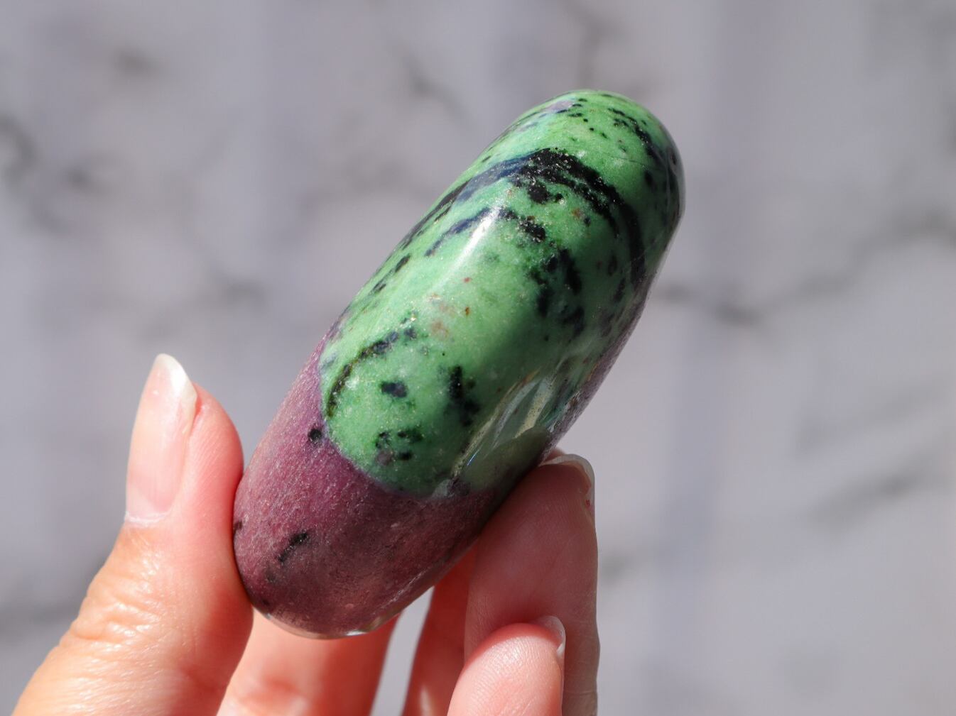 和名を灰簾石(かいれんせき)と言い、緑色のゾイサイトに鉱物が混入し、部分的にマゼンタカラーの結晶(ルビー)が見られるのがルビーインゾイサイトの特徴です✨
