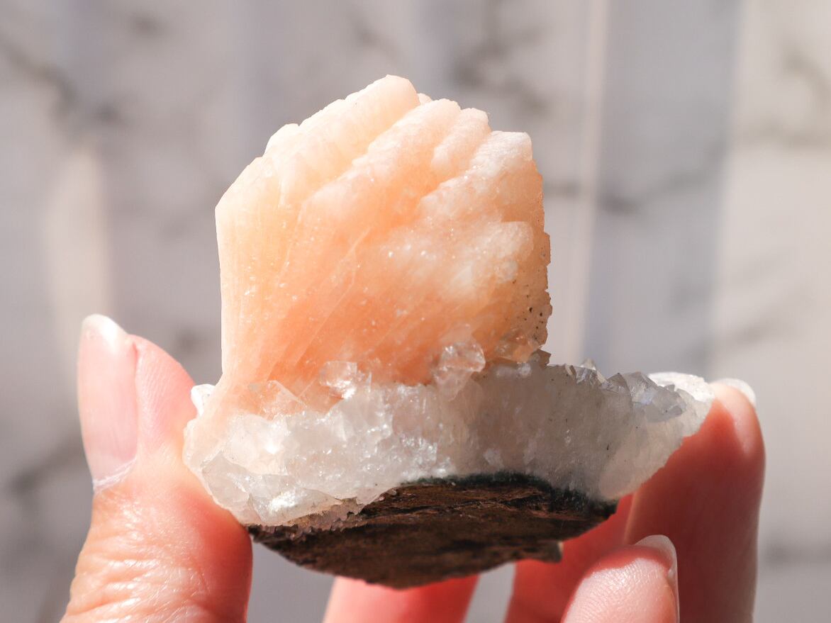 サーモンピンク色の、まるでチューリップのようにも見える、スティルバイトが存在感を放つ、アポフィライトとの共生クラスターをご紹介します♡