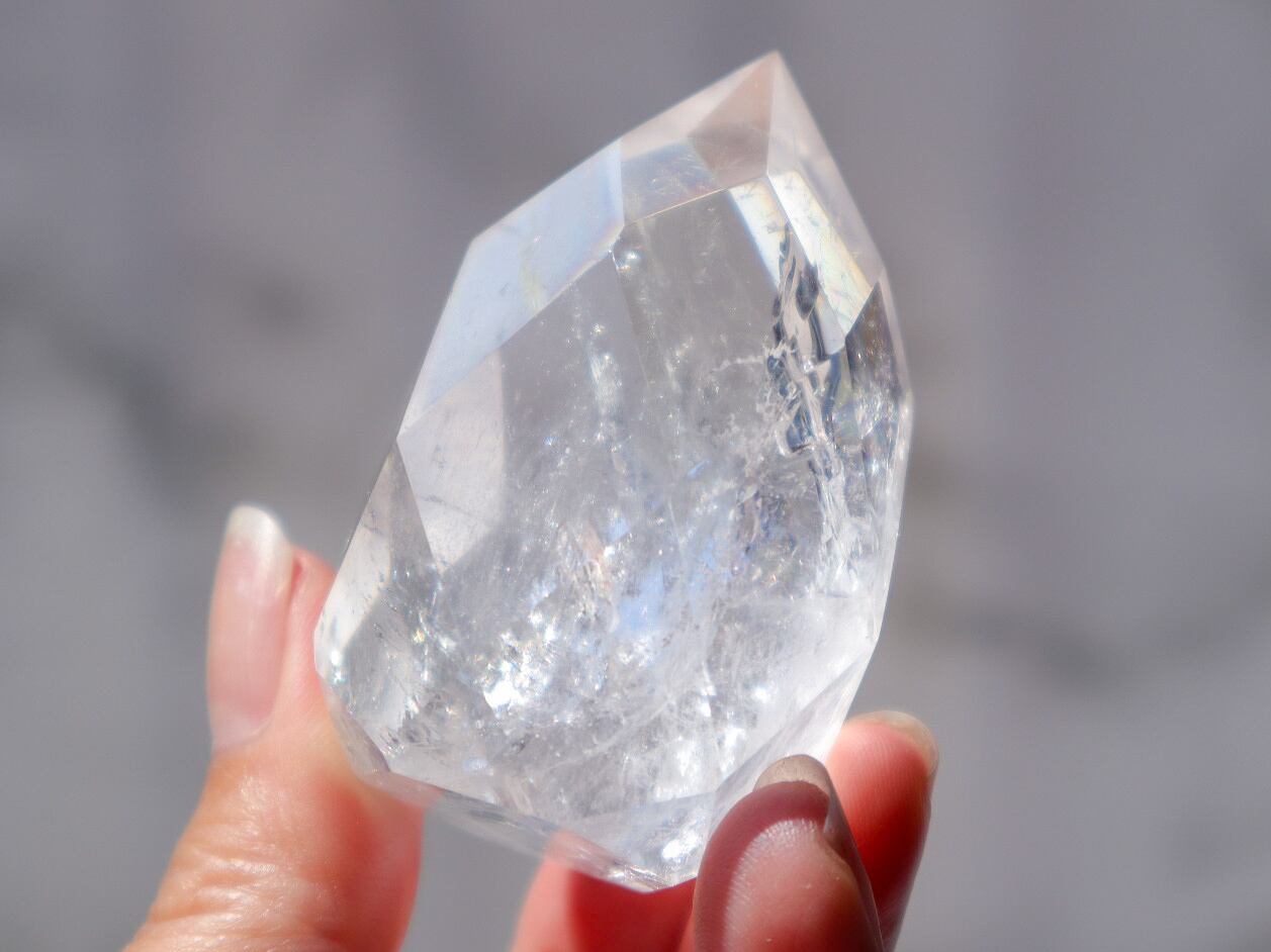 透明感あり、虹ありの美しい水晶に、いくつものカットが施された見事な形✨✨カットが多いので、光を反射してサンキャッチャーのような役割もしてくれます✨どのような場所にどのように配置するか、考えるのもワクワクですね♪