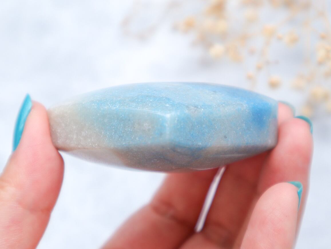 淡いブルーであっても、どことなくくすみを感じる優しい色合いで、なんとも不思議な神秘的な魅力があり、癒しを感じる人も多く、近年とても人気が出てきた石です♡