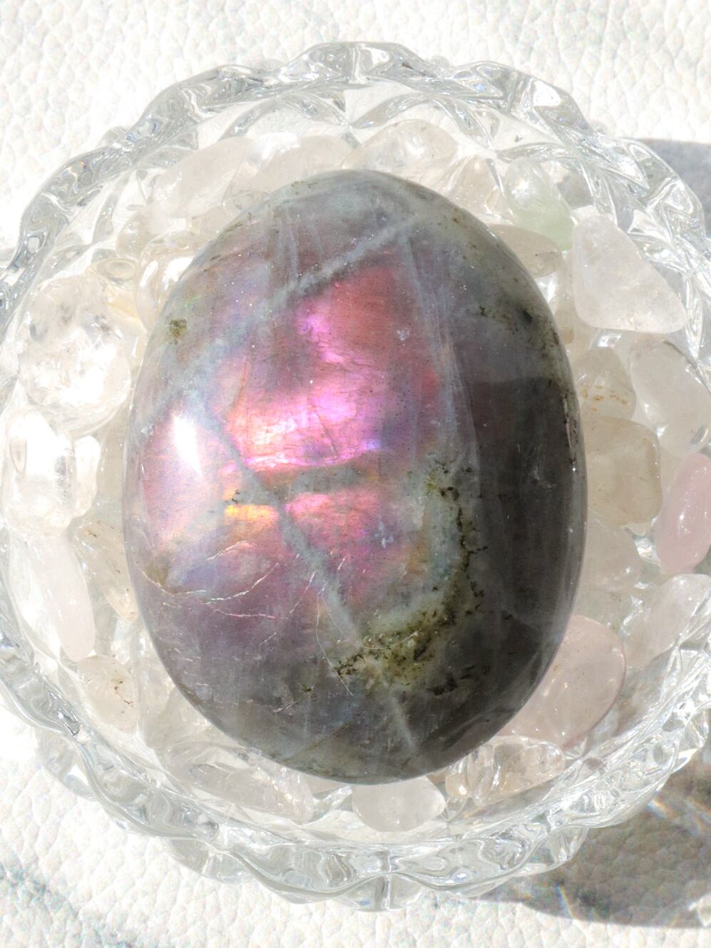 このこは両面素敵なピンクが輝きます♡ピンク、オレンジとイエロー、パープルが絶妙に混ざって美しいです✨その間に細かな虹も輝きます✨✨やはりピンクラブラドライトは魅力的で特別感があります♪