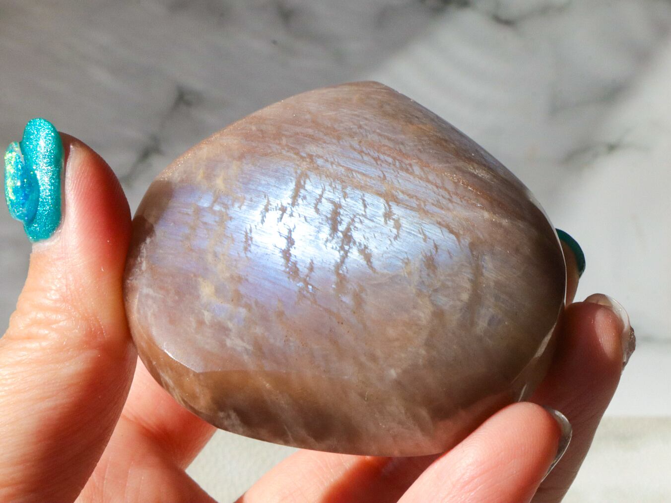 自然光と室内光だとまた違った良さを感じることが出来ます✨暗めの室内でムーンストーンにだけ光を当てるようにしてみると、余すところなくこのこの良さをご堪能出来ると思います♡小振りでフォルムも可愛くてさりげないインテリアとしても活躍してくれます♪