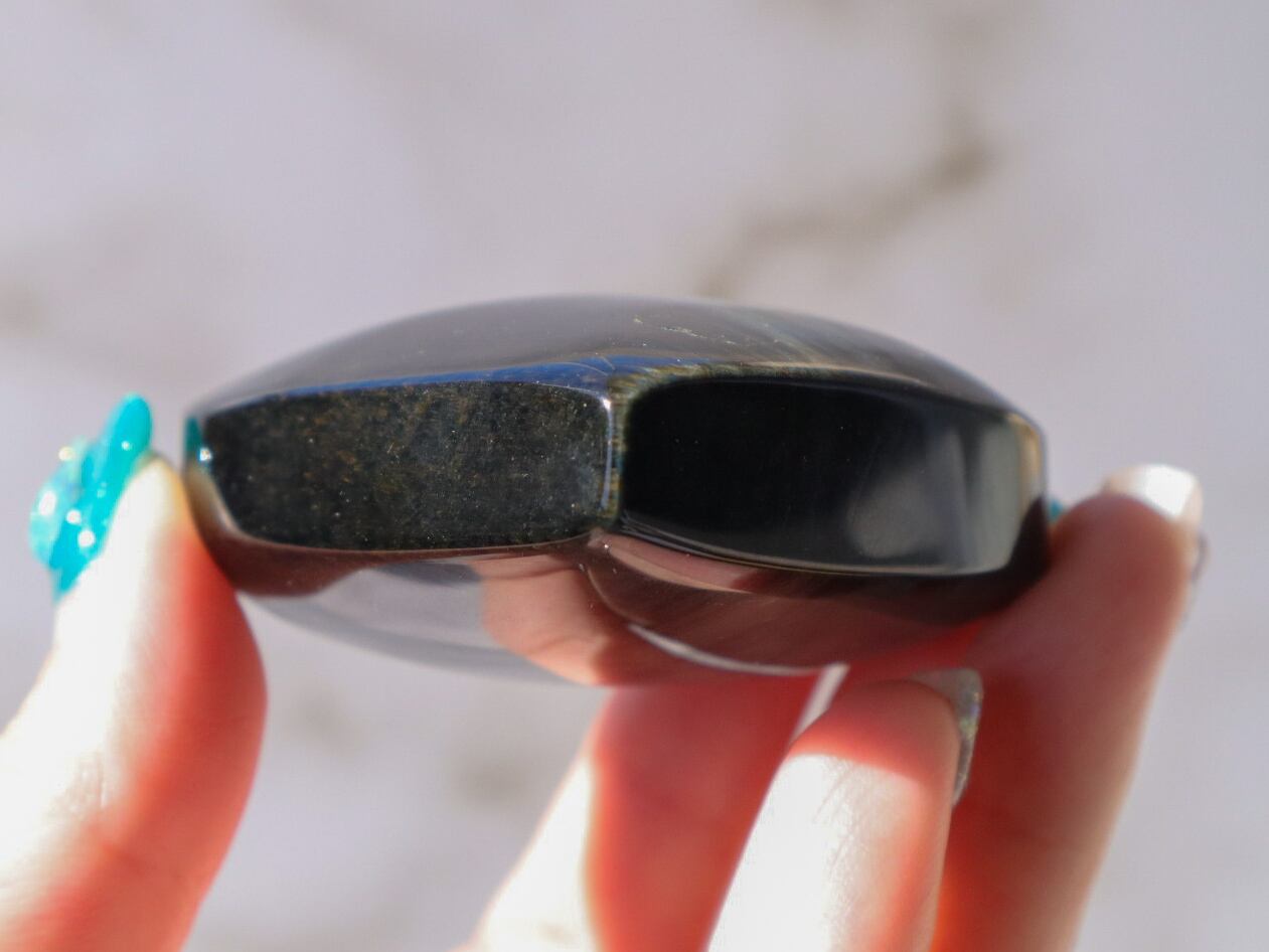 また、このこは一見真っ黒ですが、光を当てて見ていくと美しいブルーと、ゴールドが入り交じったシラーが現れます✨表、裏、ハートの上から見てもシラーを楽しめます♪