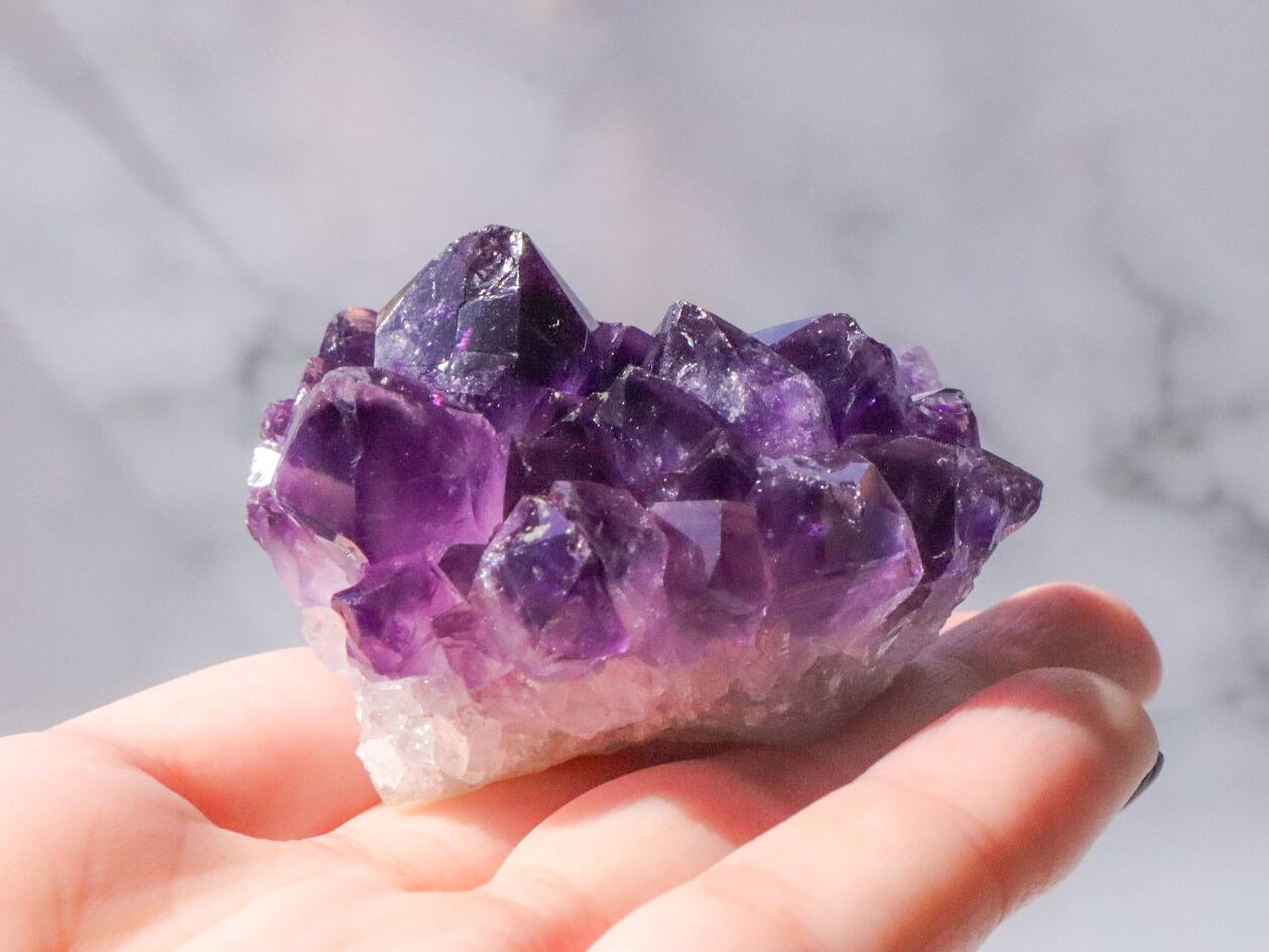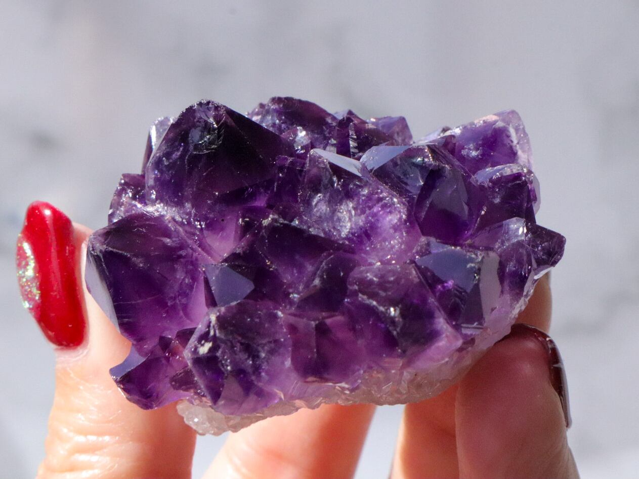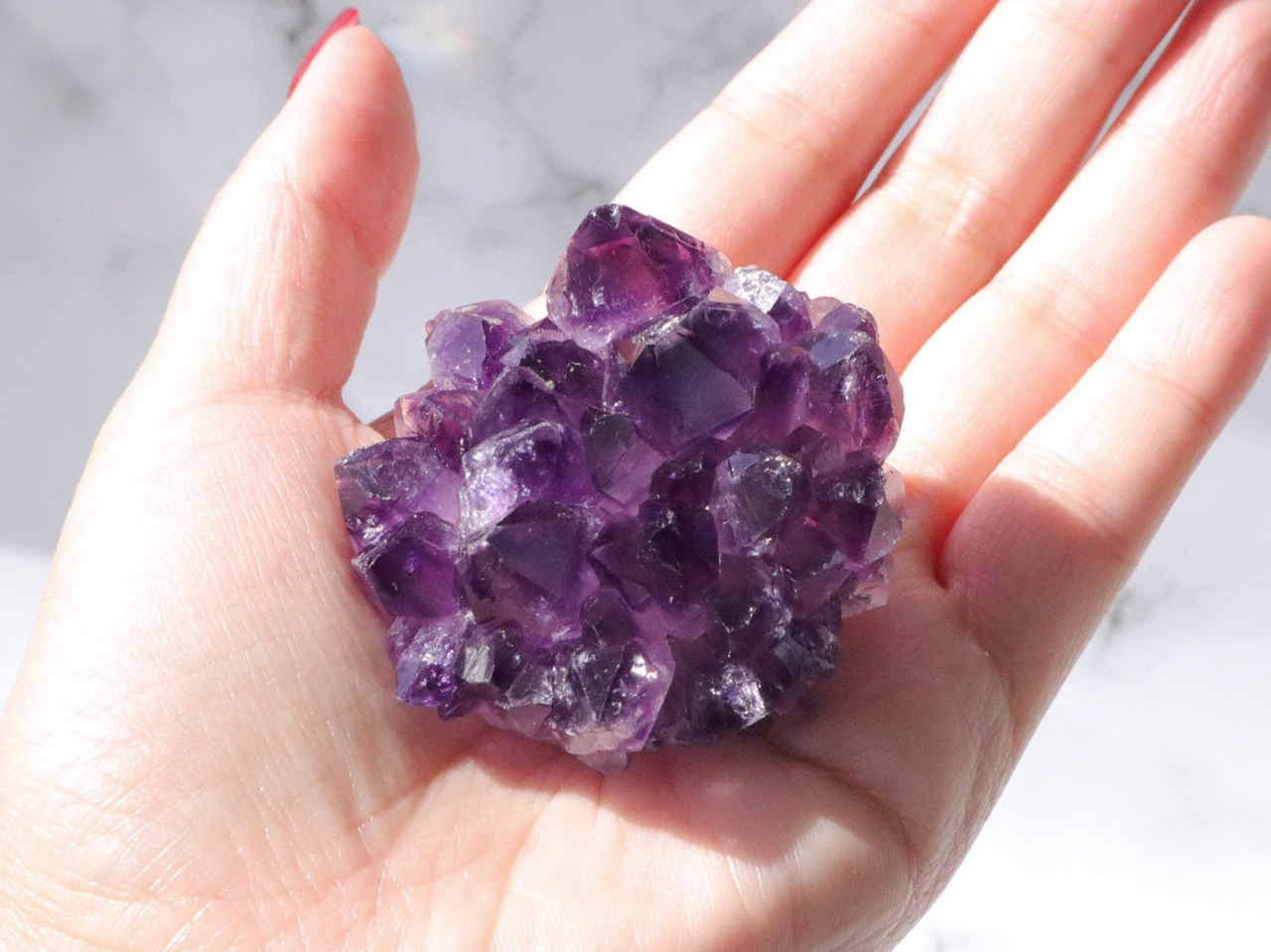 一粒一粒の透明感があり、花びらのように四方に広がりキラキラと輝きます✨✨結晶には欠け等ありますが、それも個性と思って受け止めてくださる方にお迎え頂きたいです✨輝きは変わらないので、いつまででも、くるくるしながら眺めて居られます♡♡♡かなり濃い色の紫なので、小さめですが、存在感のあるこです✨✨✨