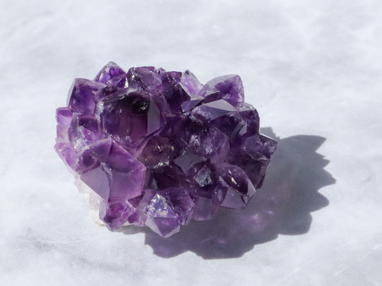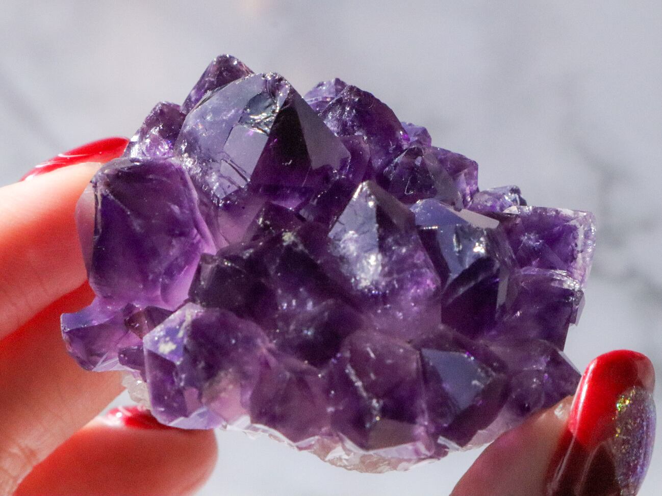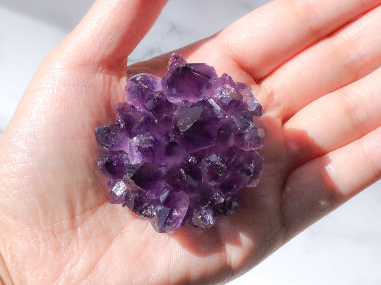 一粒一粒の透明感があり、花びらのように四方に広がりキラキラと輝きます✨✨結晶には欠け等ありますが、それも個性と思って受け止めてくださる方にお迎え頂きたいです✨輝きは変わらないので、いつまででも、くるくるしながら眺めて居られます♡♡♡かなり濃い色の紫なので、小さめですが、存在感のあるこです✨✨✨